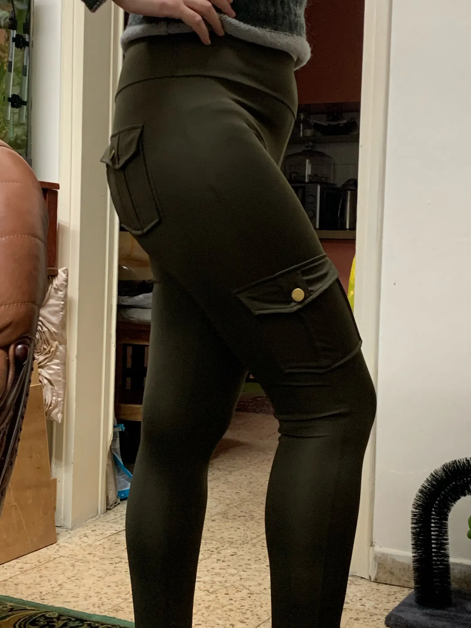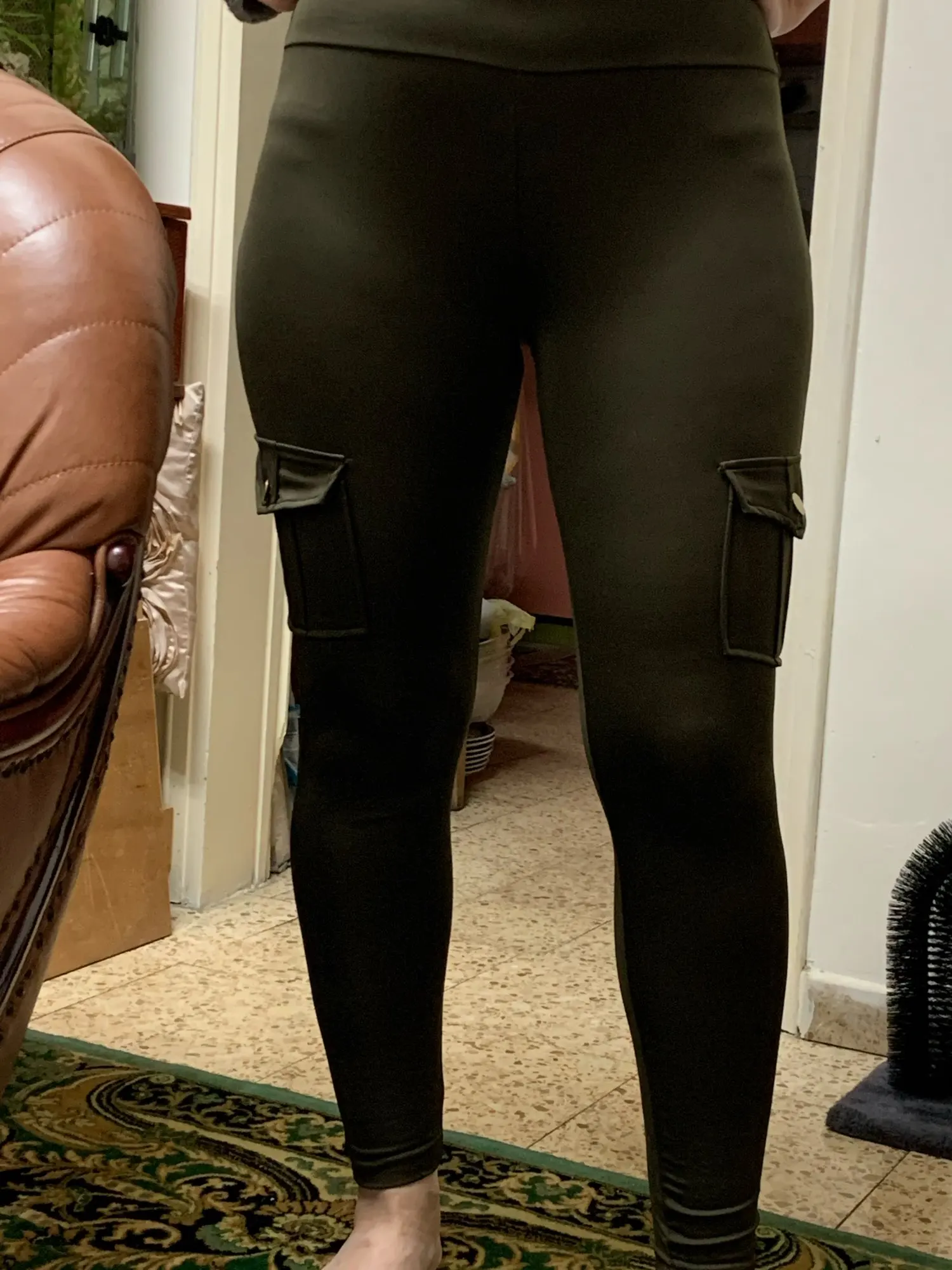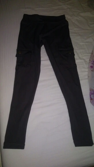 Карманы всё-таки не удобные оказались, чуть выше колена. Леггинсы, как леггинсы. Короткие, талия высокая и слишком широкая. Есть вшитая резинка в поясе, узкая, не на весь пояс. Но хотя бы пришита с двух сторон, есть шанс, что не будет сильно закручиваться.