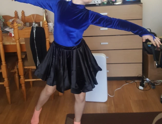 Отличная юбка, то что нужно для тренировок чтобы увереннее чувствовать себя на паркете. Доставка быстрая- около трёх недель. ткань синтетика что-то среднее между бифлексом и атласом. Единственное с размером нужно угадать, желательно брать на размер (а то и на два) больше, чтобы не давила в талии и была по колено. Мы брали 130-140 см на наш рост 120 см - сидит как раз, без запаса. Однозначно рекомендую! спасибо продавцу ))