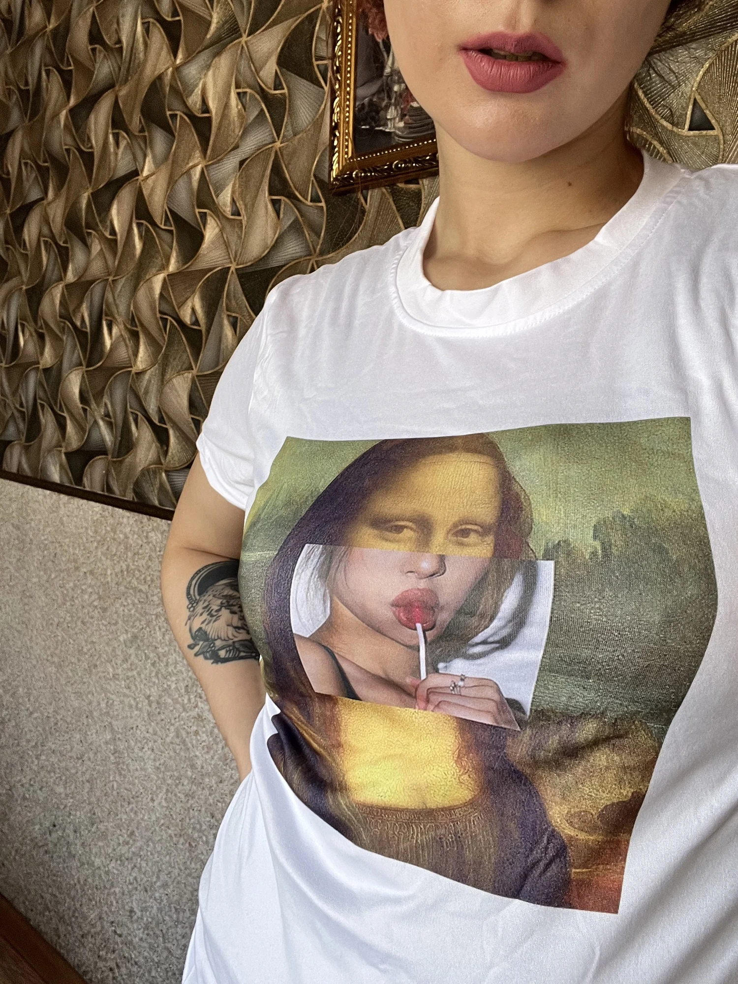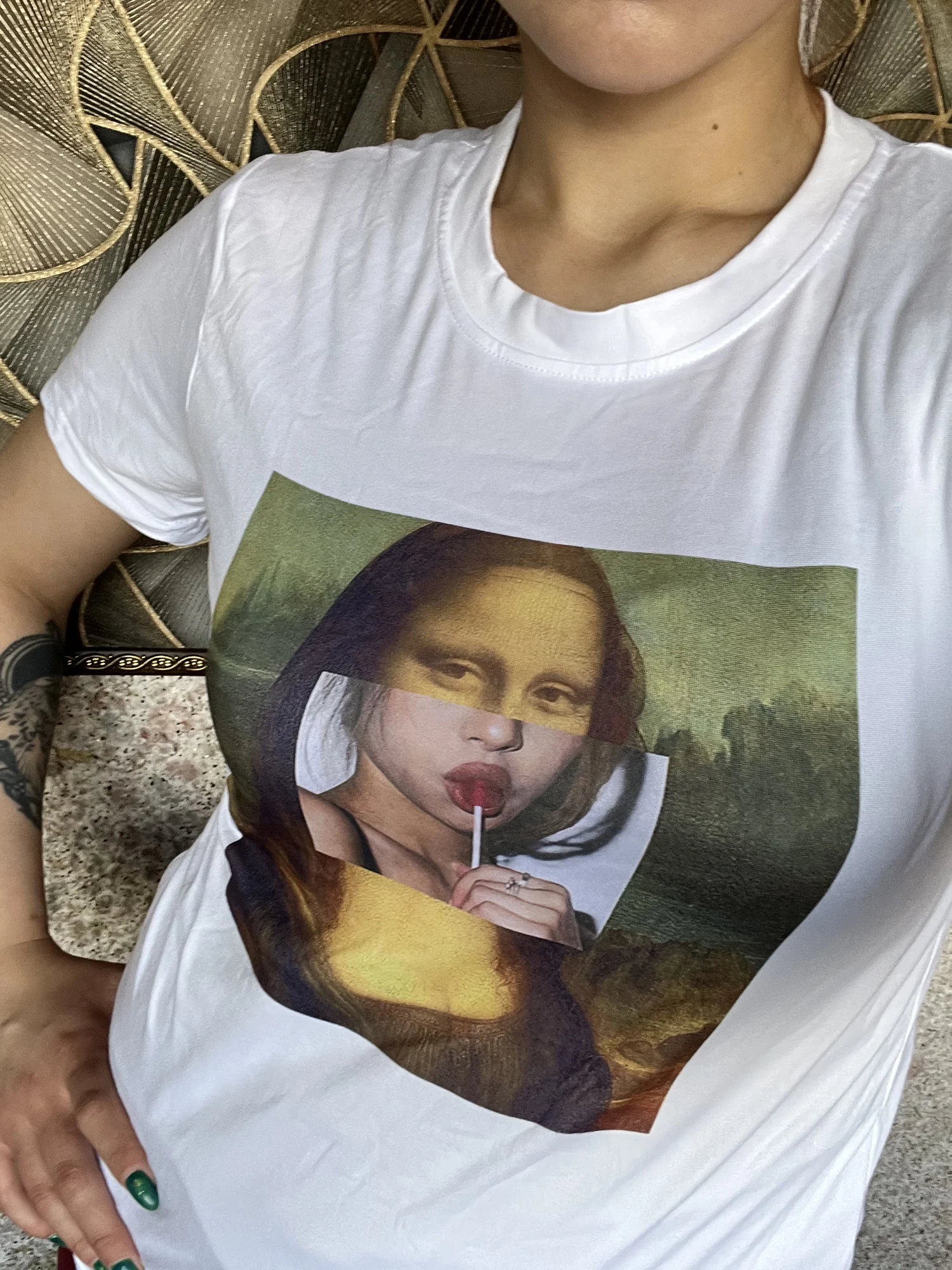 Feature 6Spoof Famous Painting Mona Lisa Funny T-Shirt Women