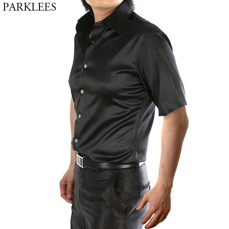 Стильная черная шелковая рубашка для мужчин, Новинка лета 2019, мужские классические рубашки с коротким рукавом, гладкая атласная Мужская рубашка клуб диско вечеринка, сорочка 3XL
