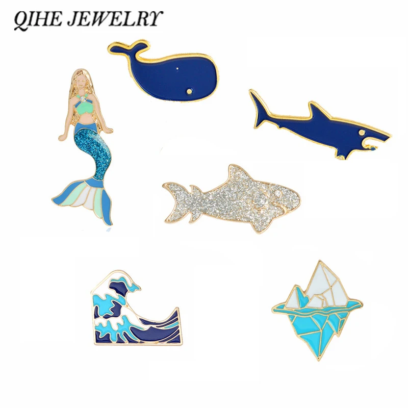 Эмалированные булавки с изображением синих акул и китов, животных о...