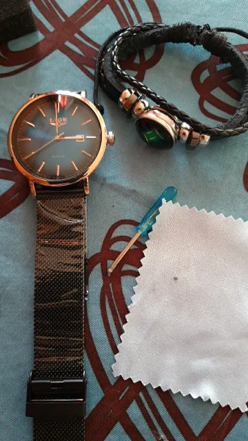 Циферблат часов немного темнее, чем на фото. Часы большие, что удобно людям с плохим зрением, не нужно надевать очки, чтобы увидеть время. Купила за 800 рублей. Продавец положил в посылку браслетик из бусин. Что было приятным сюрпризиком.