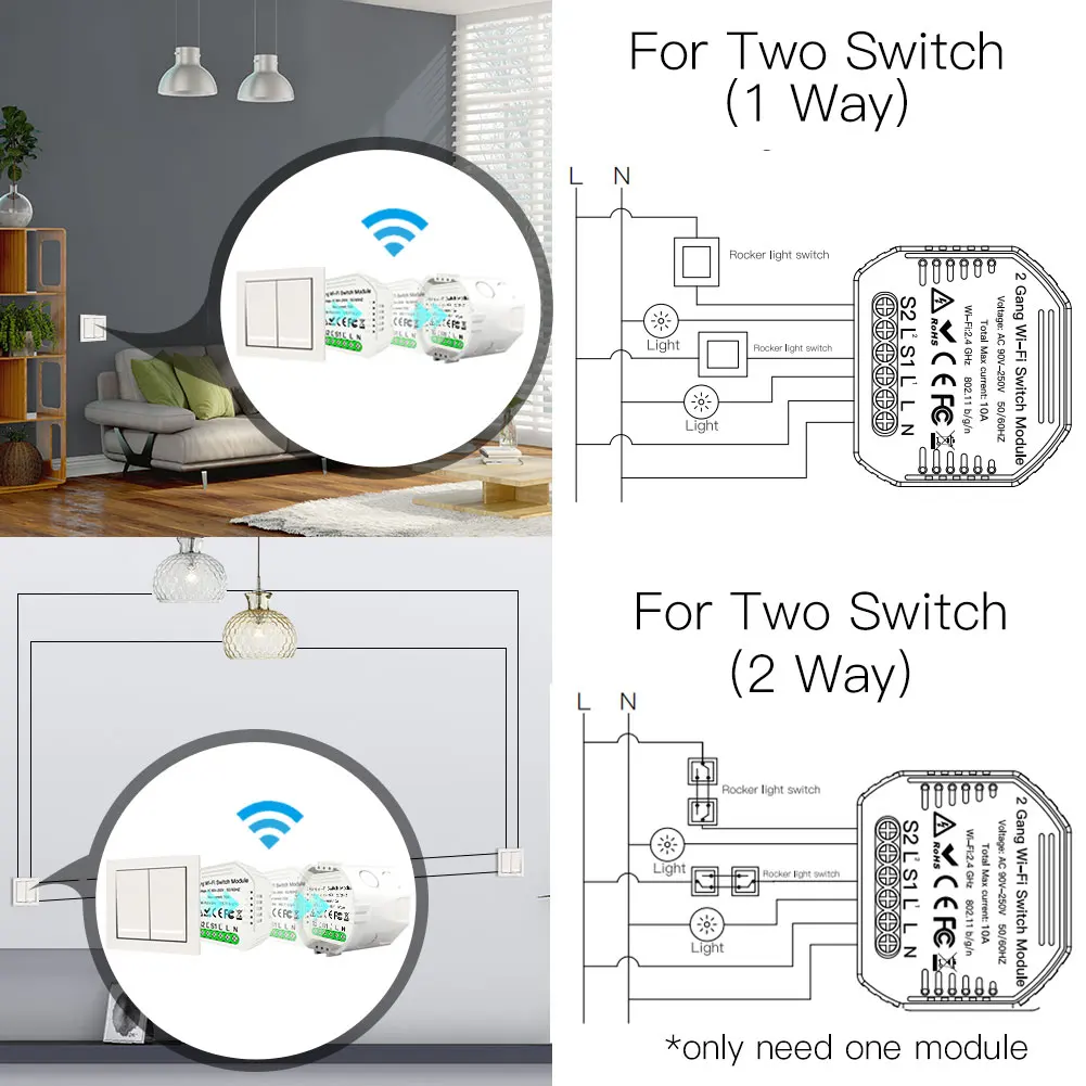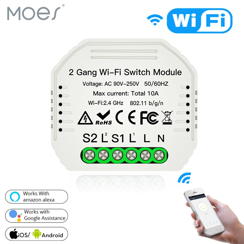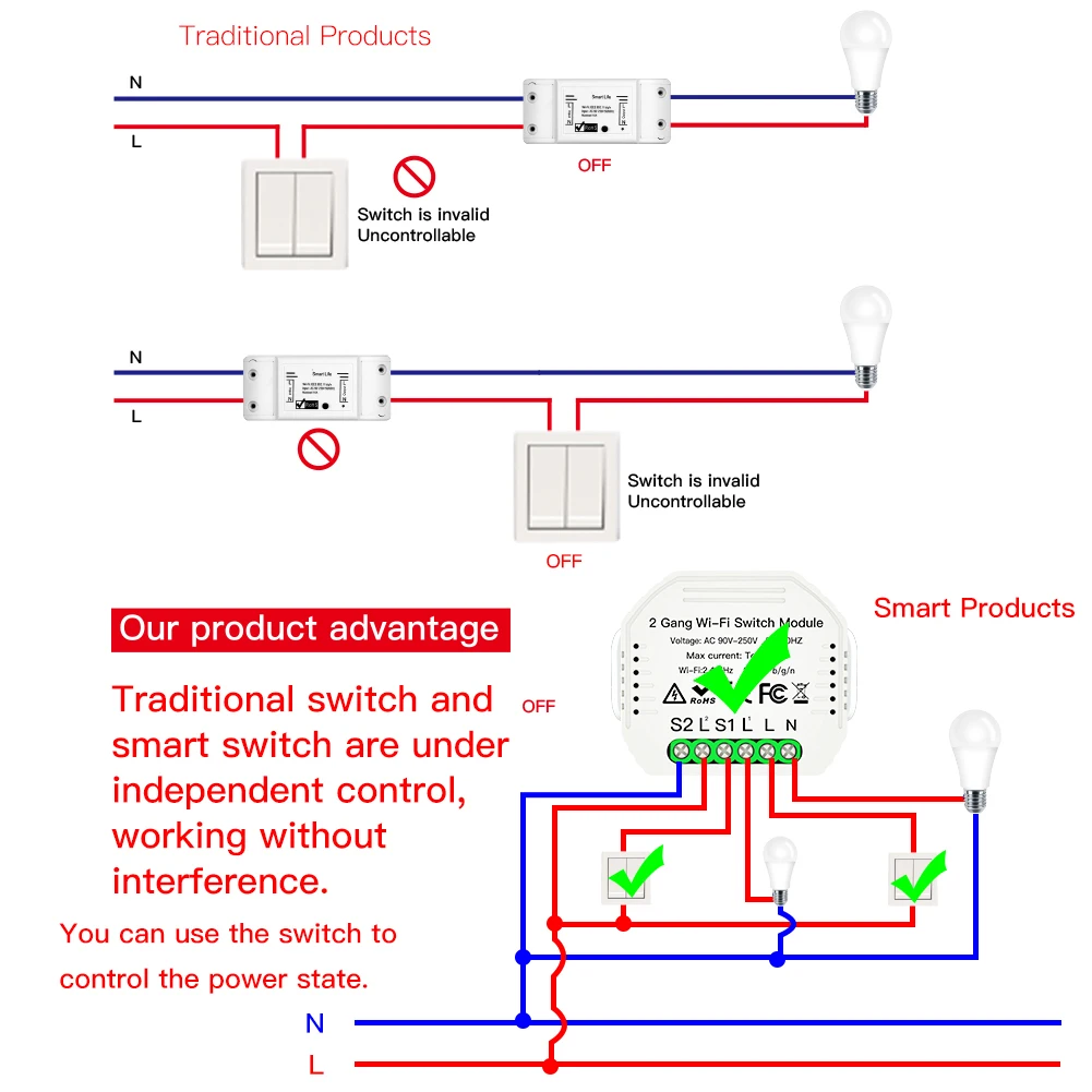 1.EasIlyЗамените традиционный переключатель наВаша жизньСмартЭр. Чтобы сделать ваш 2-канальный переключатель смарт, вам просто нужно установить один умный переключатель, который подходит дляКоробка переключателя ЕС/Великобритании. ПАренда coНПроверьте размер перед заказомИНГ.