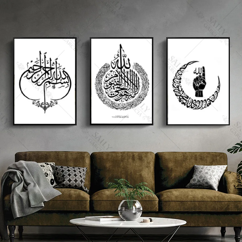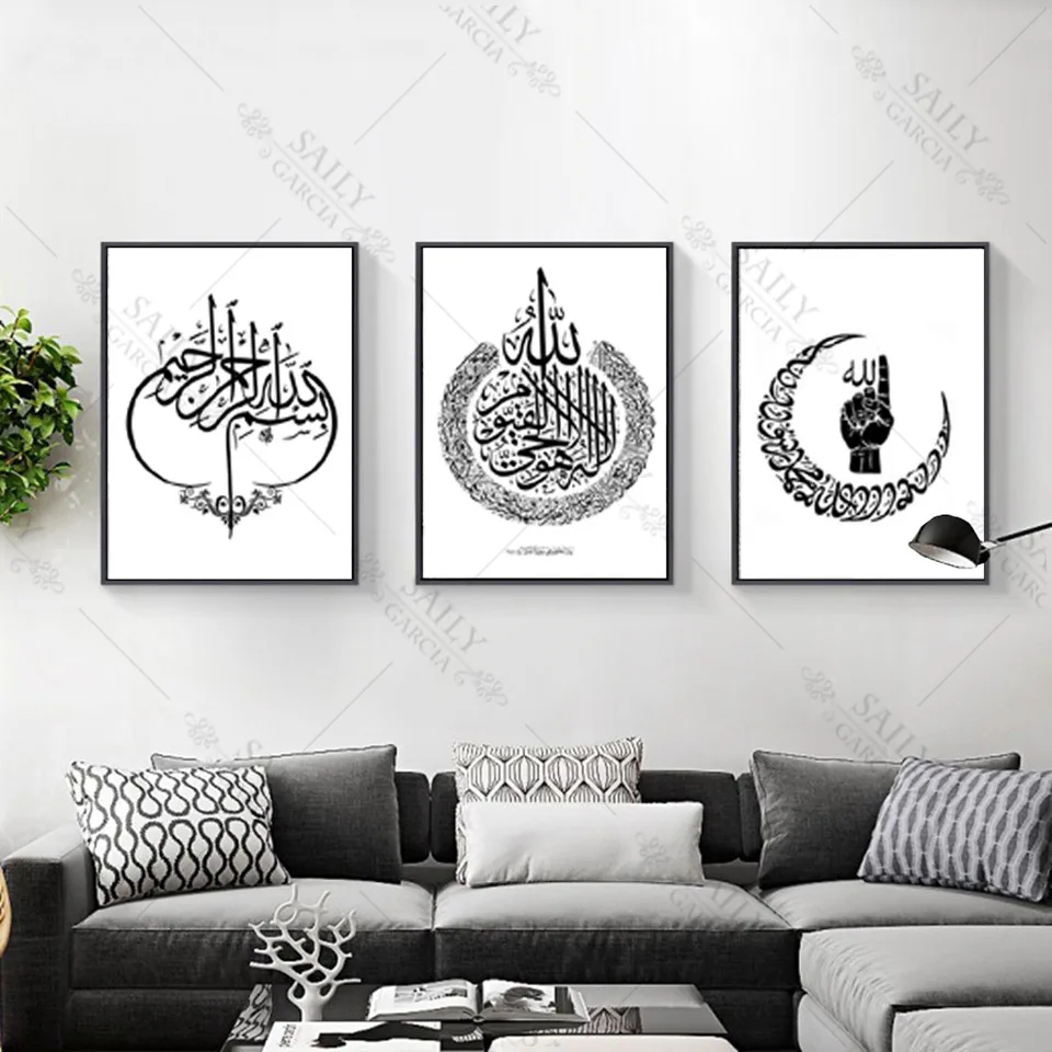 Абстрактный исламский, арабский каллиграфия принты для художественных холстов картины черно-белые плакаты модульное Настенное панно для домашнего декора