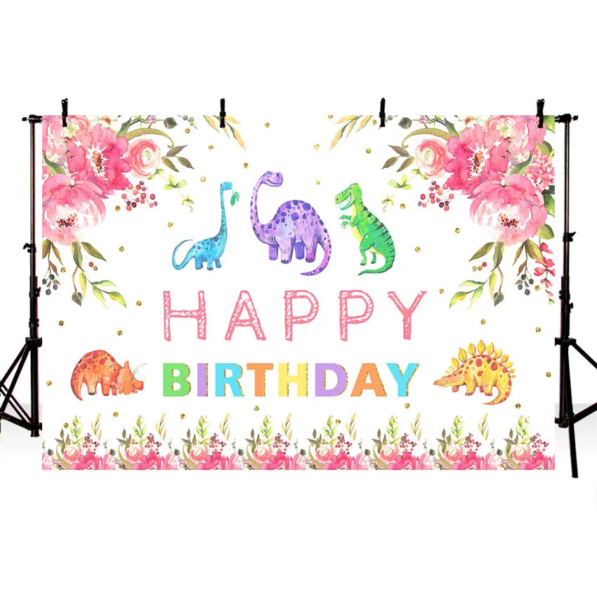 Фон для фотосъемки с акварелью, динозавром, розовыми цветами Happy фон для фотосъемки на день рождения для детей, блестящие волнистые точки