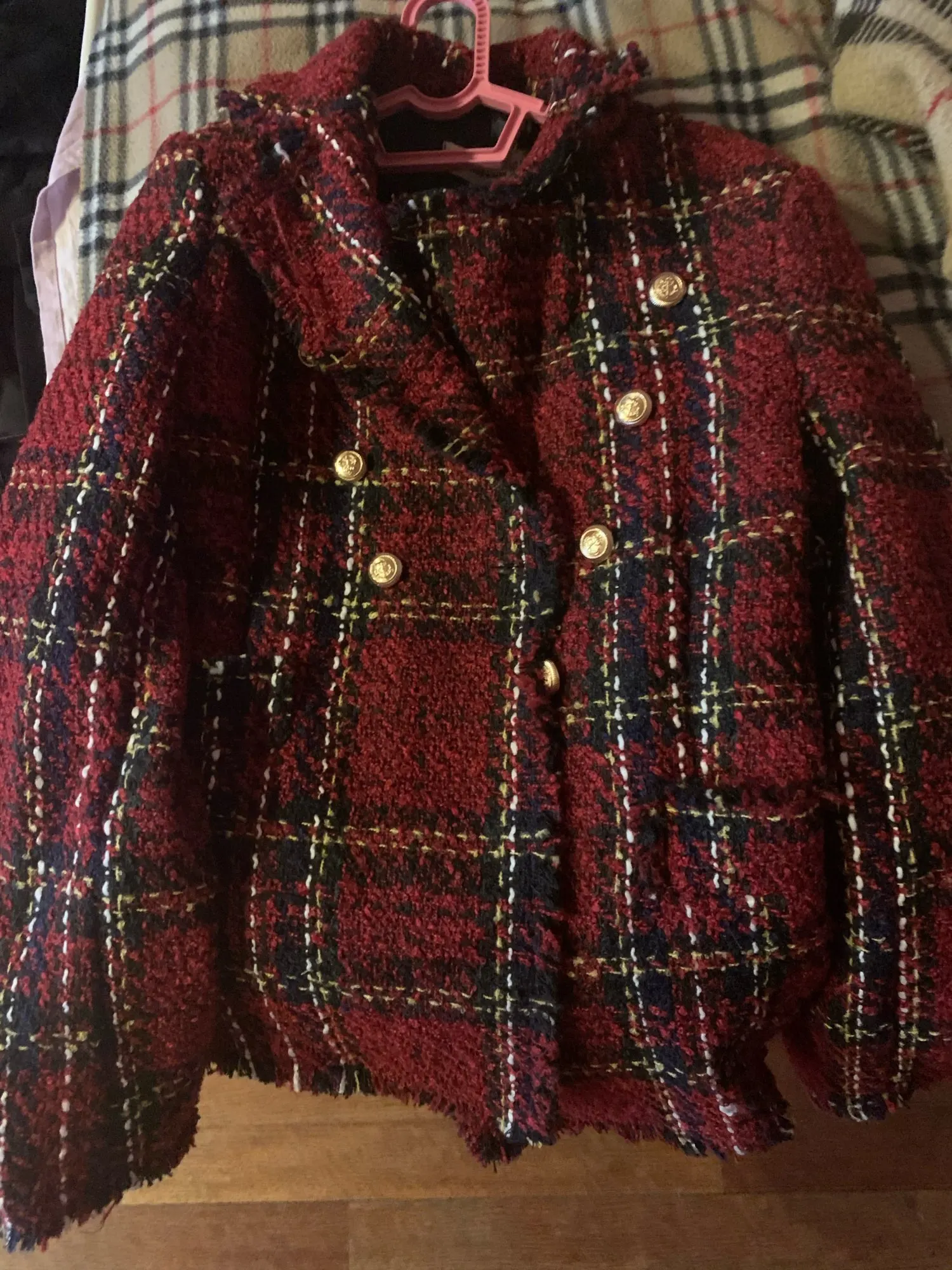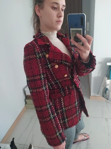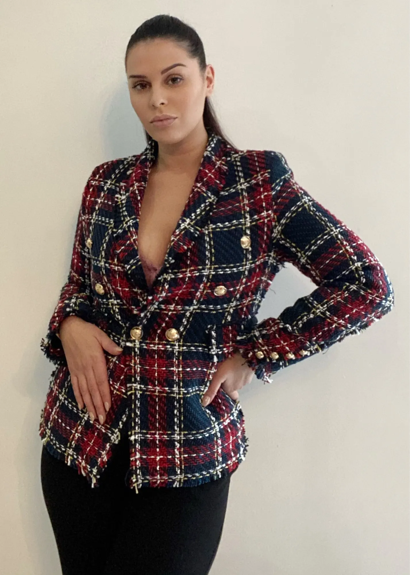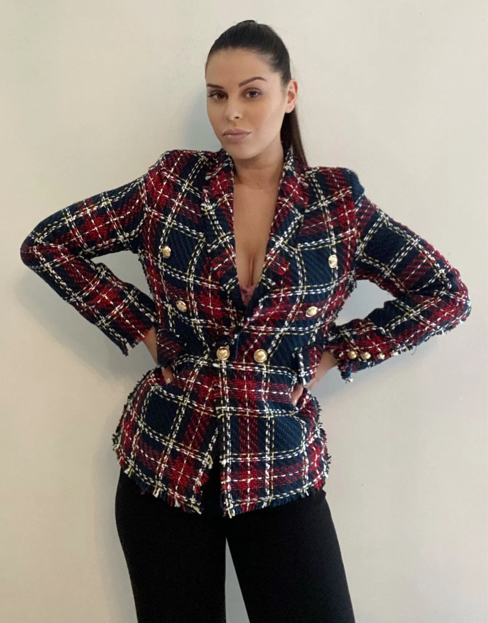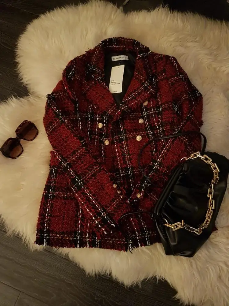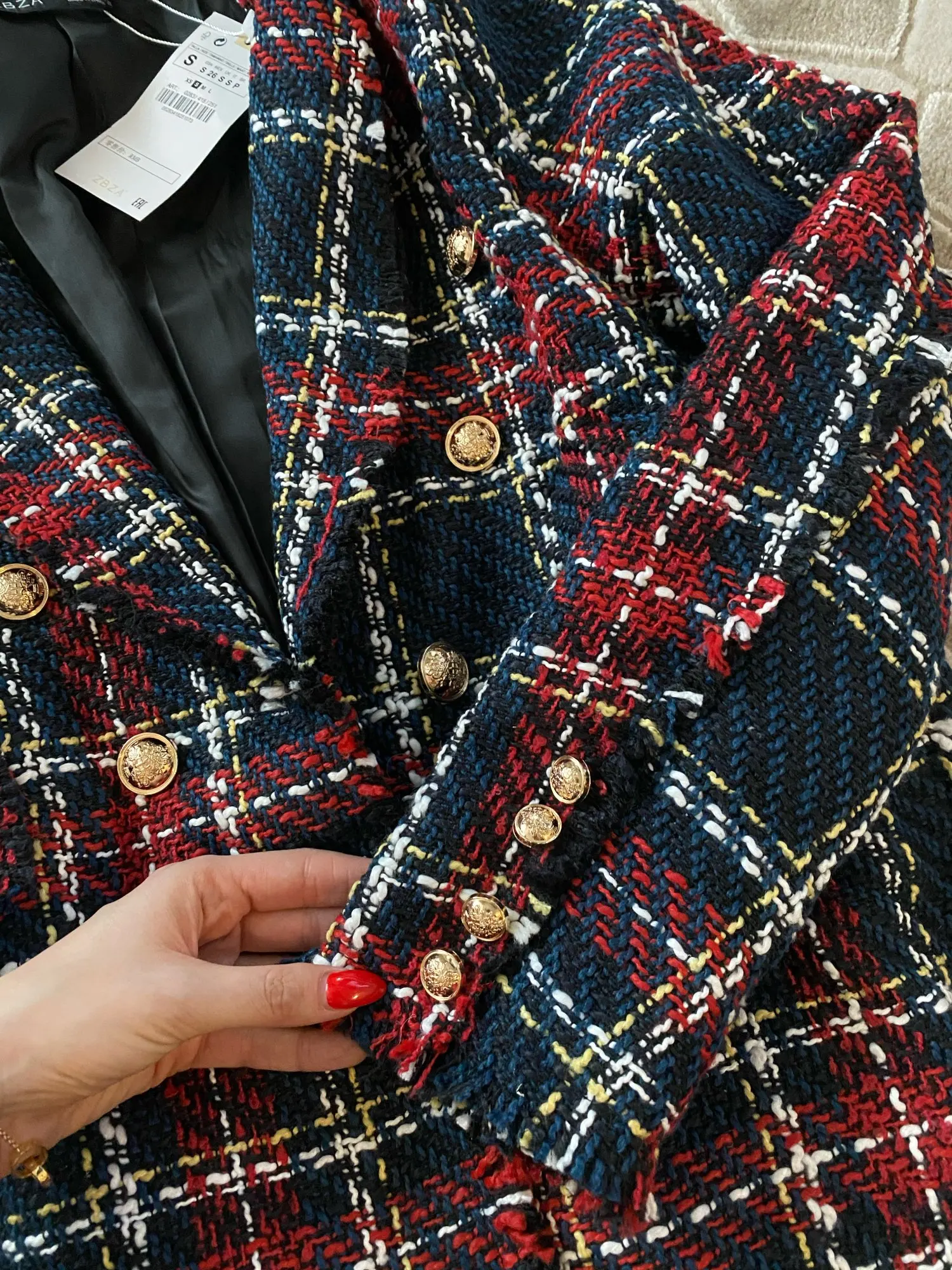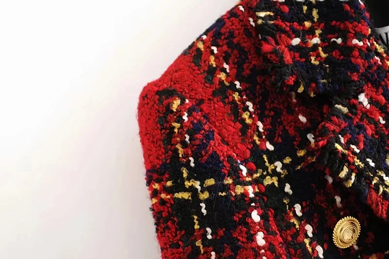 Красный Клетчатый Блейзер 2021, женские весенне-осенние винтажные Твидовые костюмы, куртки, офисные женские шикарные приталенные блейзеры, топы с бахромой для девочек, комплект пальто