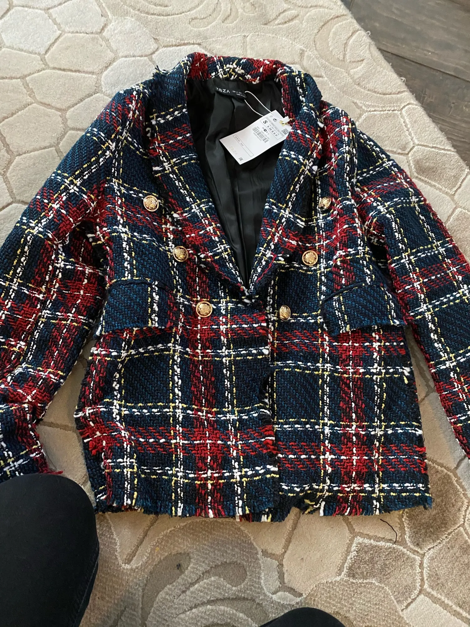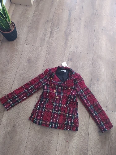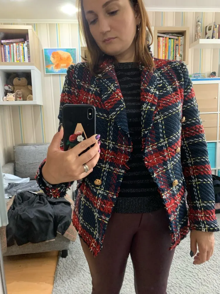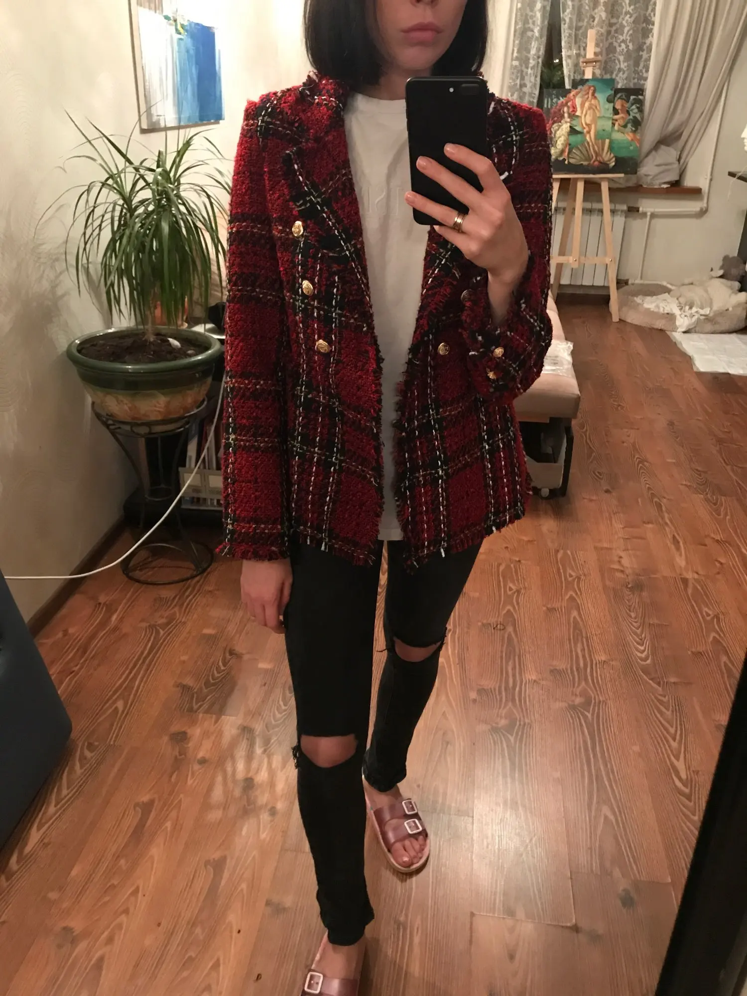 Начиталась отзывов, думала , что реально Зара))) качество хорошее, пиджак тяжёлый, все швы и пуговицы аккуратно, больше уличный вариант,(тёплый))). Однако мне кажется коротковат. Учитывая то что манжеты карманов на уровне талии, силуэт выходит квадратный. Но расстёгнутый вроде как и ничего. Доставка до Тулы 7 дней