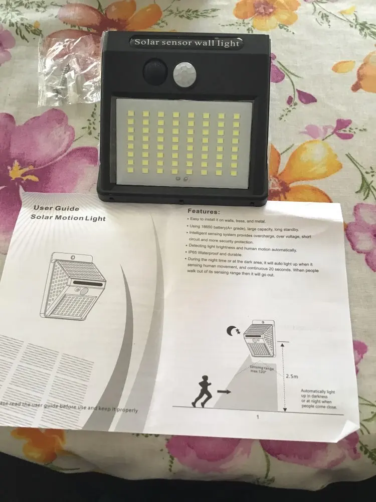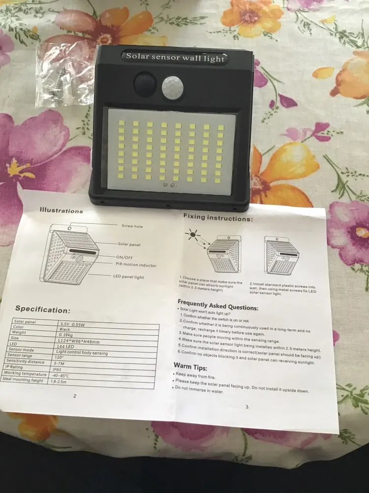 Доставка за несколько дней до двери! Качество на 4, наклейки отлетели ещё в упаковке, в остальном всё норм. По работе: света достаточно, работает только в темноте, датчик движения с 5-6 метров срабатывает на отлично (дальше не пробовал), гаснет через 15-20сек.