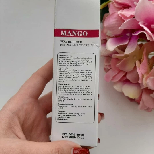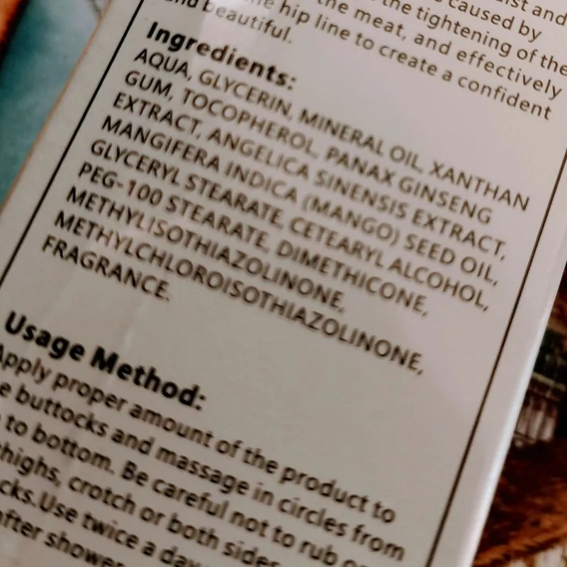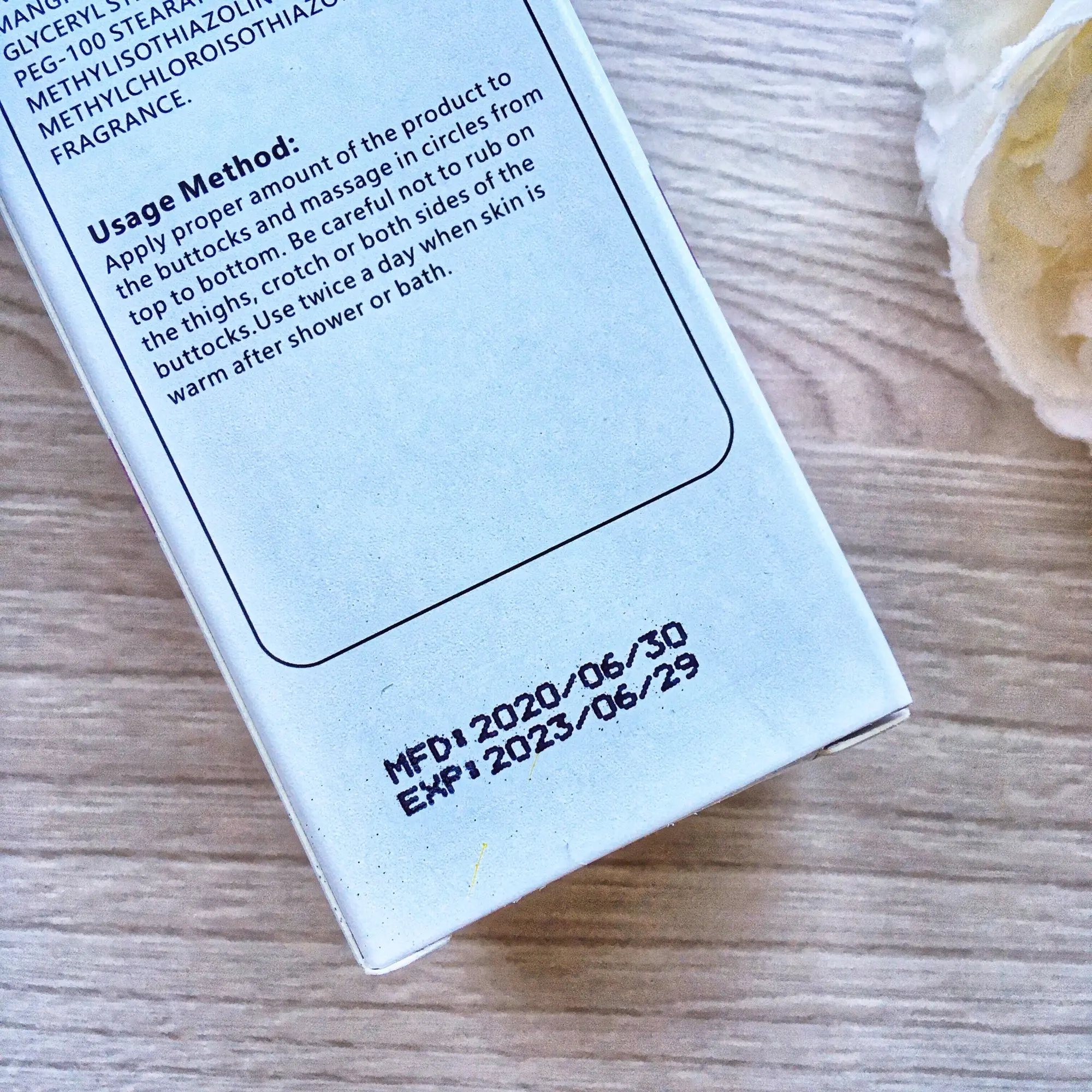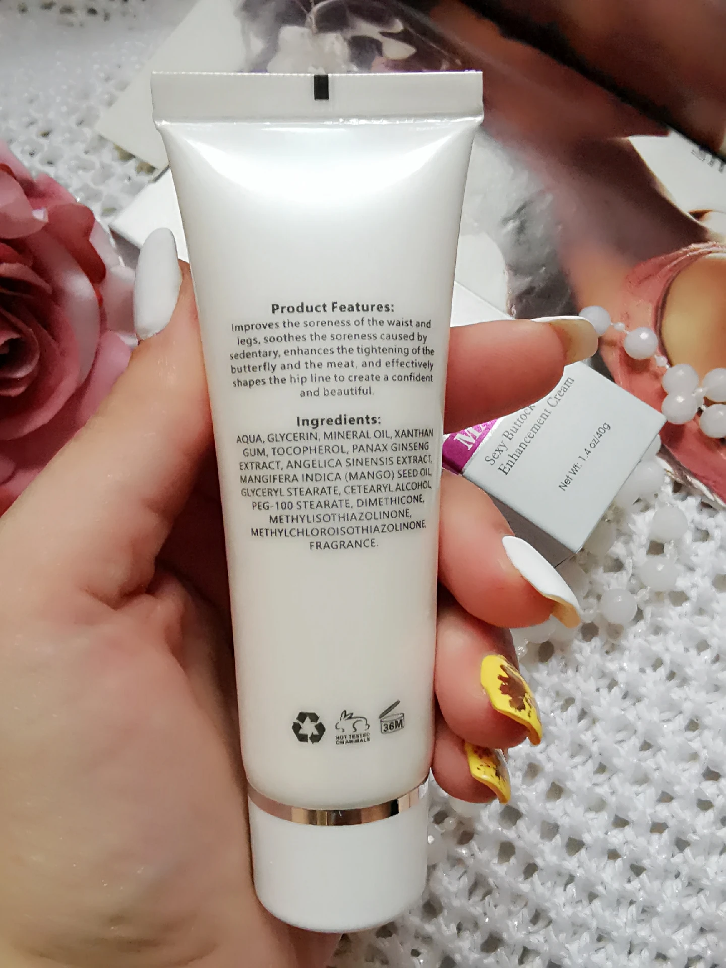 Крем для ягодиц с маслом семян манго (увлажняет, повышает тугор и эластичность), экстрактами женьшеня и ангелики китайской (исключительные укрепляющие, тонизирующие свойства, предотвращение растяжек), витамином Е (токоферолом), который способствует восстановлению и омоложению эпидермиса, укреплению мышц. Наношу после ванны, на распаренные ягодицы и втираю массирующими круговыми движениями (лучше не лениться и при этом, разминать мышцы, напрягая и расслабляя их). Эффект заметен, кожа становится еще более гладкой и упругой. Заказываю уже не в первый раз, очень довольна. Если сочетать с упражнениями для тренировки этой прекрасной области, которые станут системой - вообще великолепно. Аромат травяной, и не сильно выраженный. Цвет белый. Объем - 40 г. Доставка в Россию - 1 месяц. Заказ был получен в целостности и сохранности, упакован аккуратно, защитная слюда на коробке имелась - 5+