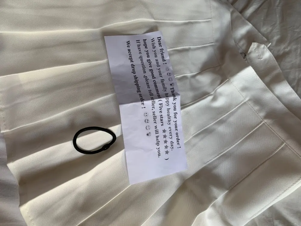 очень довольна покупкой!¡ Юбка пришла полностью целой и даже не помятой (на фото юбка только что с посылки); пуговка хорошо нашита; под юбкой шортики, ткань достаточно плотная. Доставка до Украины менее двух недель. В подарок положили записку и резиночки (мелочь но приятно!). На обхват талии 66 и обхват бёдер 90 — S подошла отлично