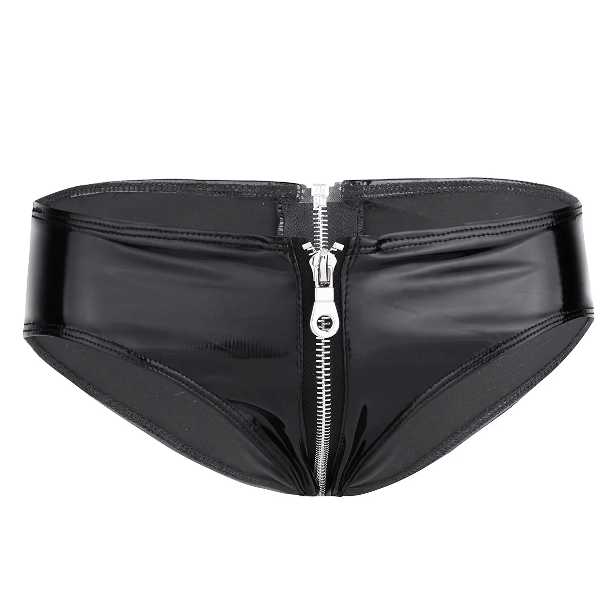Женское нижнее белье, нижнее белье с открытой промежностью, шорты из лакированной кожи, бикини на молнии, сексуальное нижнее белье, эротическое латексные трусы