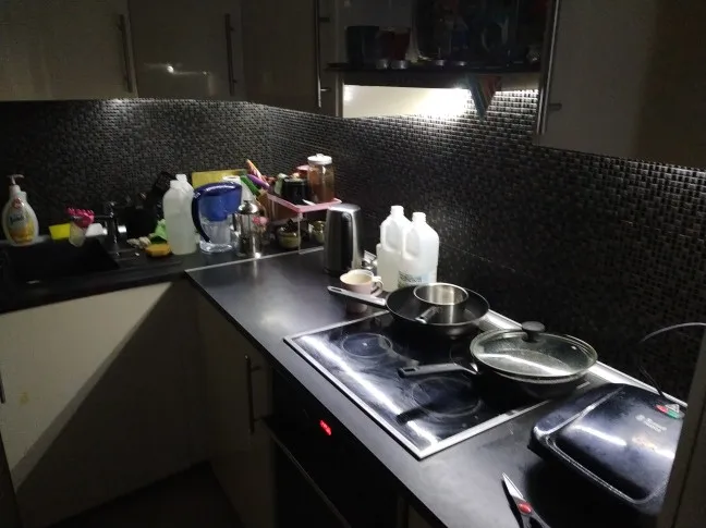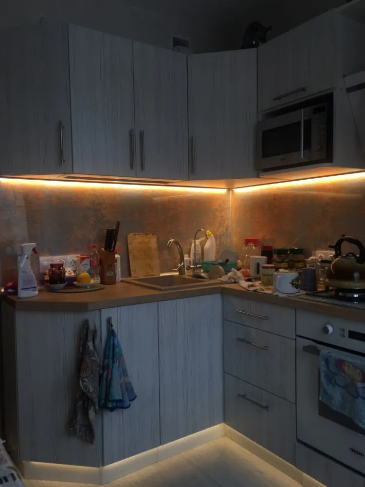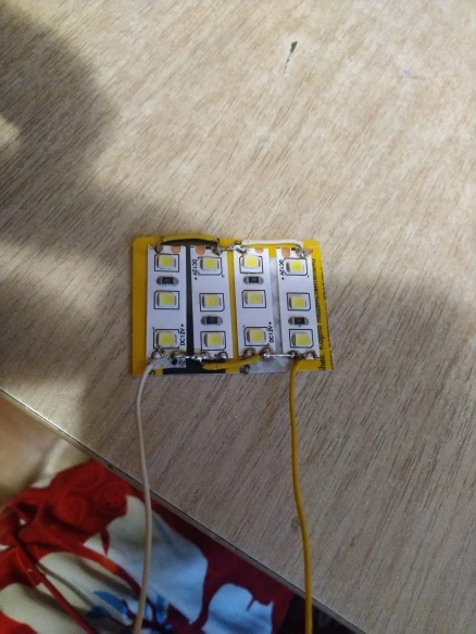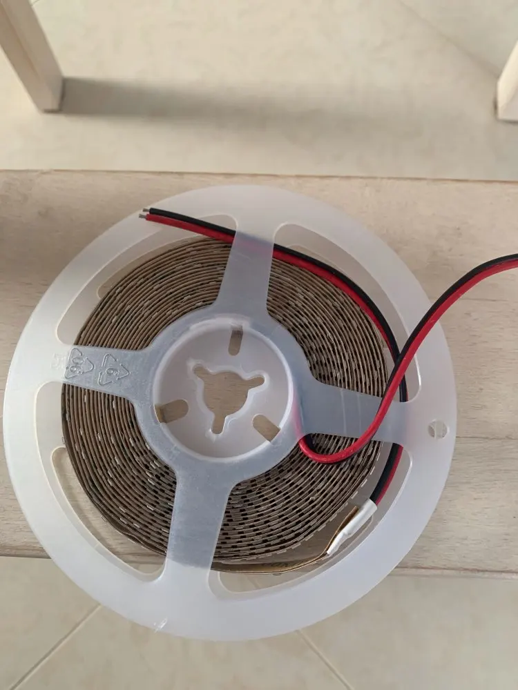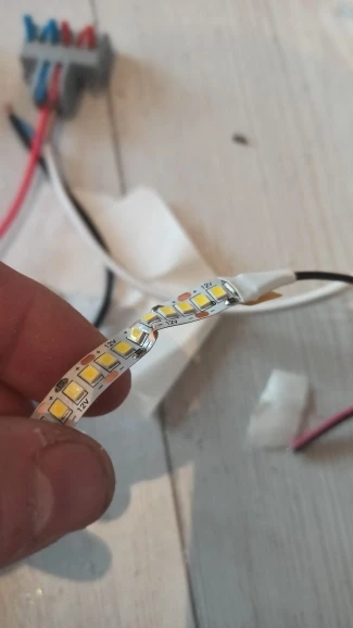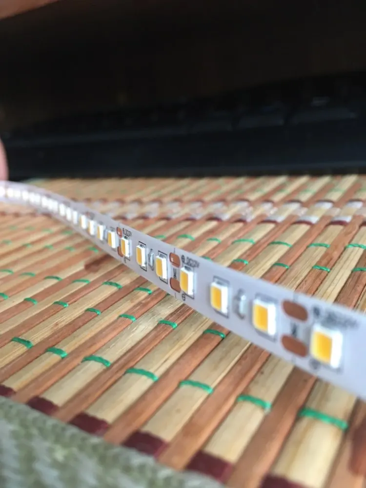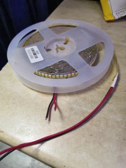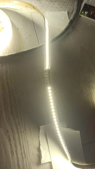 Как обычно не понятно какие ваты на метр указаны в описании. Лента яркая, подпаянна с двух сторон. 240 св/м, 2,7м/п как-бы не ярче верхнего света вышло (3 лампы по 11 вт).