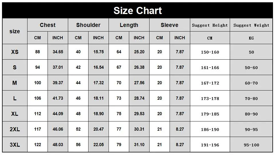 Примечание 2: Размер: Есть 7 размеров (XS, S, M, L, XL, 2XL, 3XL) для следующего списка. Азиатский размер 1 дюйм = 2,54 см, 1 см = 0,3937 дюйма,
