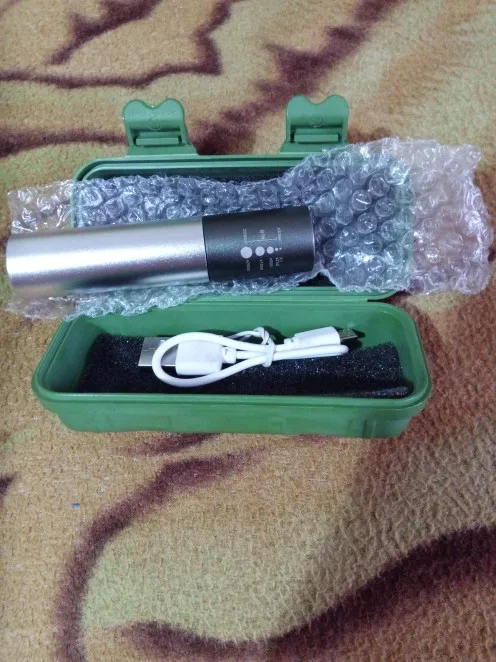 Заказ оплачен 15.11. Уже 17.11 появился трек номер, но не отслеживаемый. Пришло в отделение почты россии примерно в начале января 2021. То есть доставка около двух месяцев. Упаковано зато отлично. Пакет пупырка желтый, внутри все снова обернуто в пупырку. Фонарь идет в пластиковом чехле. Внутри фонарь и провод для зарядки. Пришел заряженным. Линза выдвижная, можно регулировать либо узкое пятно, либо широкое освещение. Боковой фонарь светит широко. Диоды яркие. На зарядке мигает красным и горит постоянно при достижении 100%. Фонарь просто супер.