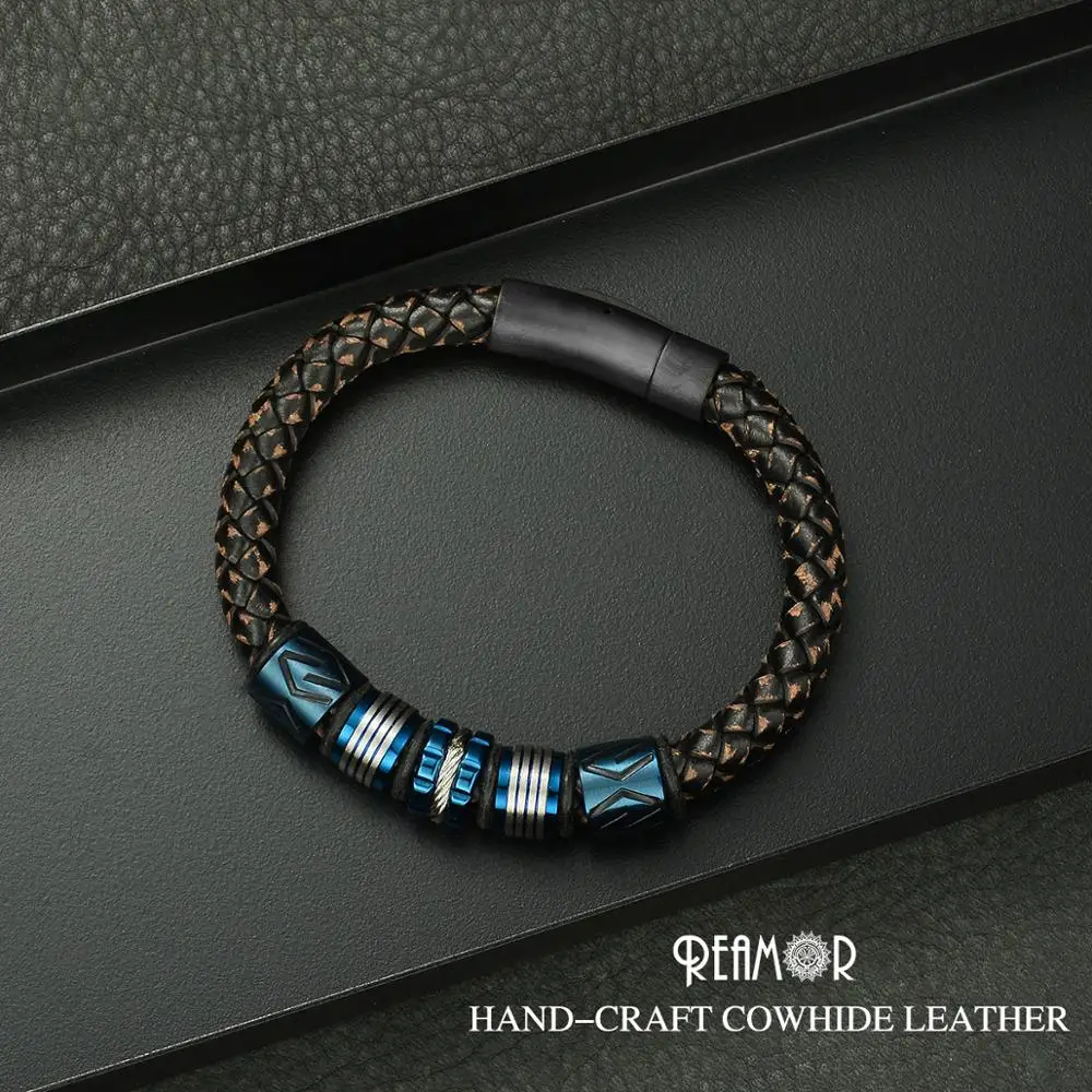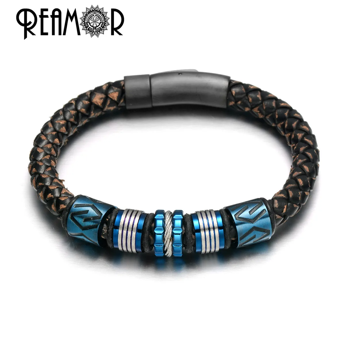 Мужской рельефный браслет REAMOR из натуральной воловьей кожи, из нержавеющей стали 316l, с голубыми бусинами с ЧПУ, ручной работы, плетеный браслет