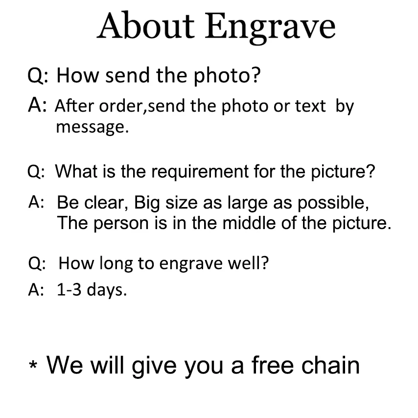 Пожалуйста, отправьте нам слова или фотографии после размещения заказаДля гравировки требуется 2-3 дня, пожалуйста, будьте терпеливы, чтобы подождать. Спасибо