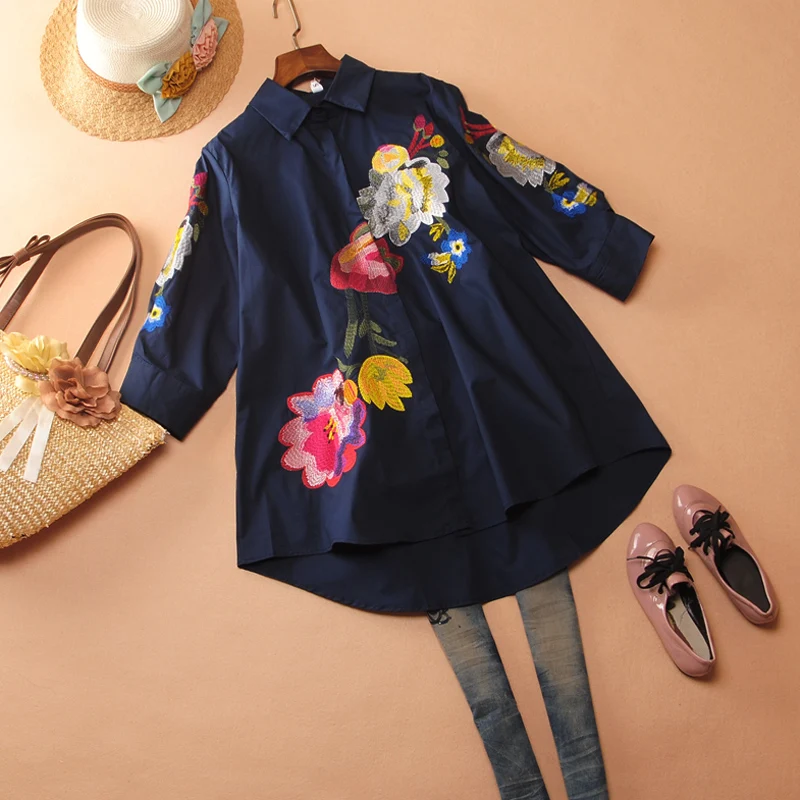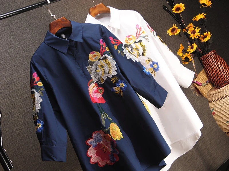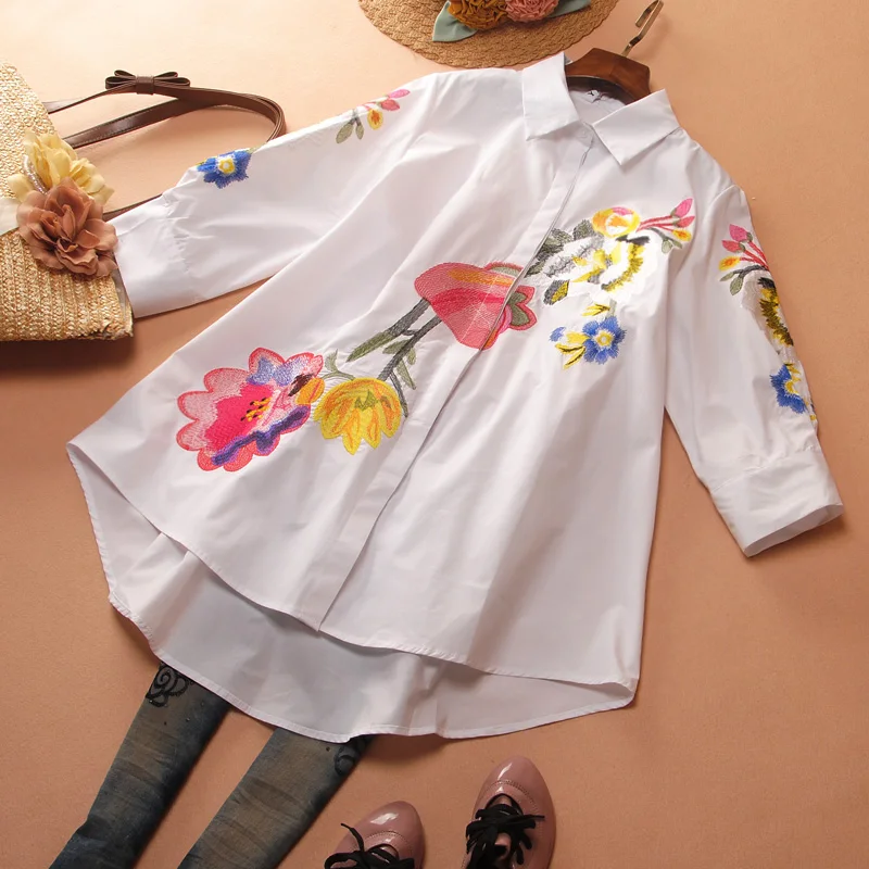 Женская рубашка с вышивкой, свободная повседневная рубашка большого размера, с рукавами семь, весна-лето, 2021