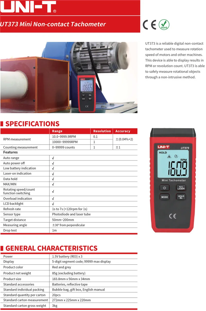 UNI-T UT373 мини Тахометр; Бесконтактный фотоэлектрический цифровой тахометрприбор для измерения скорости