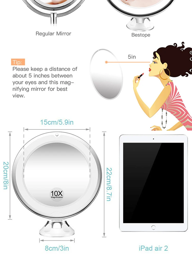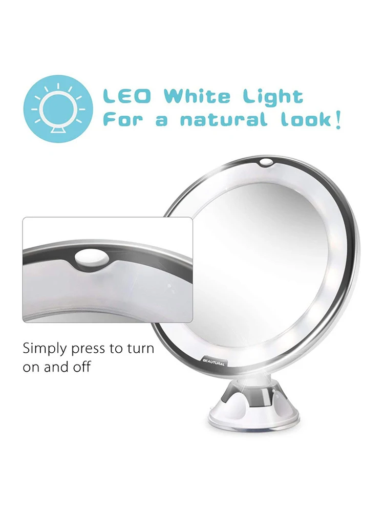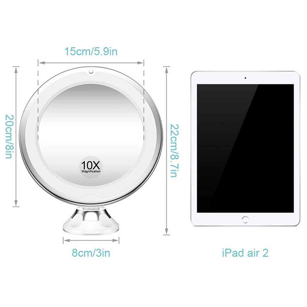 -Материал: стекло. -Размер: 20x22x8 см. -С присоской на задней части, легко крепится к любой плоской, гладкой и чистой поверхности с большой силой всасывания и свободно перемещается по поверхности, не легко отвалиться. -10-кратное увеличение идеально подходит для касаний, контактных линз и всего макияжа. -10х вариантов увеличения, чтобы убедиться, что каждая деталь на месте. -Отличное косметическое зеркало для мужчин и женщин.