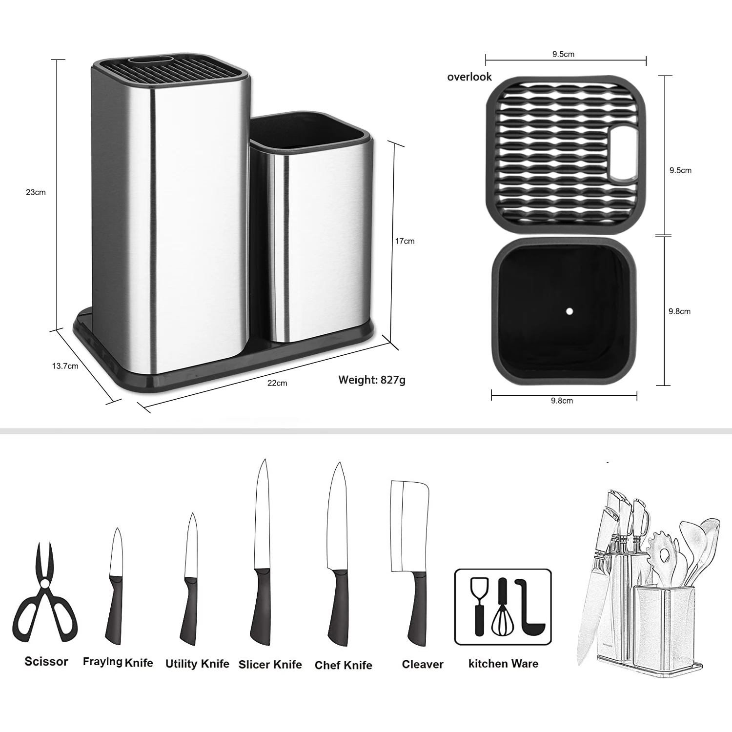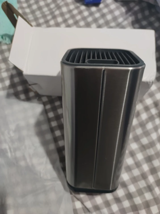 очень приятная подставка под ножи, сверху пластмассовая решетка, внутри пусто, в интерьер вписалась. быстрая отправка, достаточно быстрая доставка. упакована в коробку и 2 слоя пупырки, почта не помяла, спасибо.