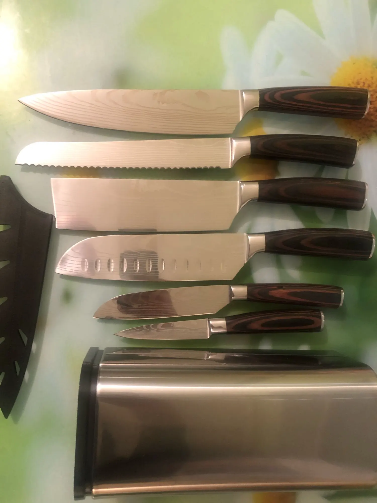 Пластик с наружным корпусом из нержавейки. С 7..8 ножами не кувыркается. Для данных длинных ножей (из комплекта) очень подходит. Пальчики, как на любой полированной поверхности остаются..