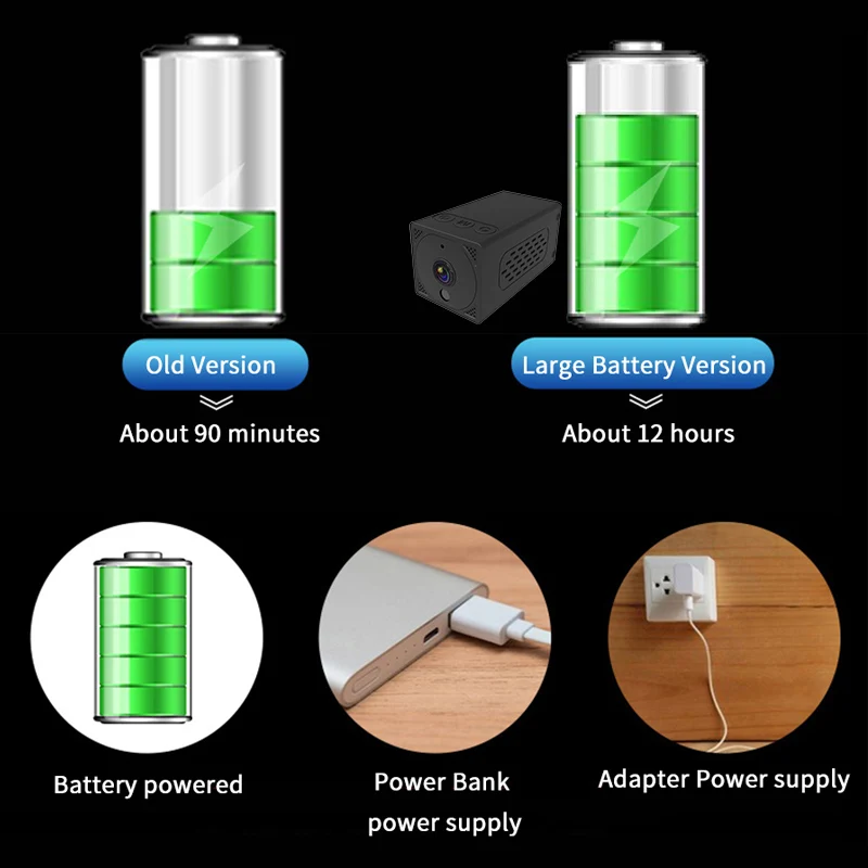 Камера имеет встроенный перезаряжаемый аккумулятор, может работать без кабеля питания в течение короткого времени. Кроме того, поддержка источника питания с помощью адаптера питания или внешнего аккумулятора (не входит в комплект).Каждый раз при полной зарядке может работать около 12 часов. Тем не менее, различные способы использования и другой план настройки приведут к тому, что время использования батареи будет отличаться, результат нашей лаборатории только для справки.