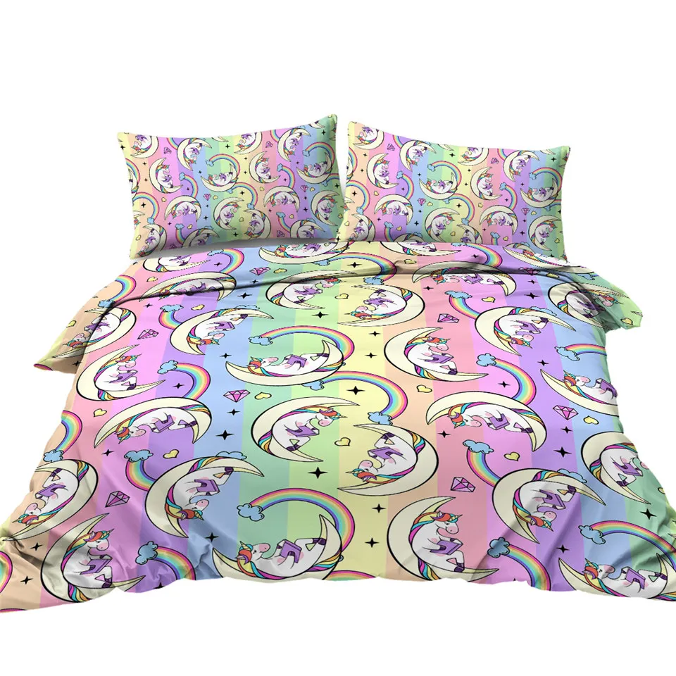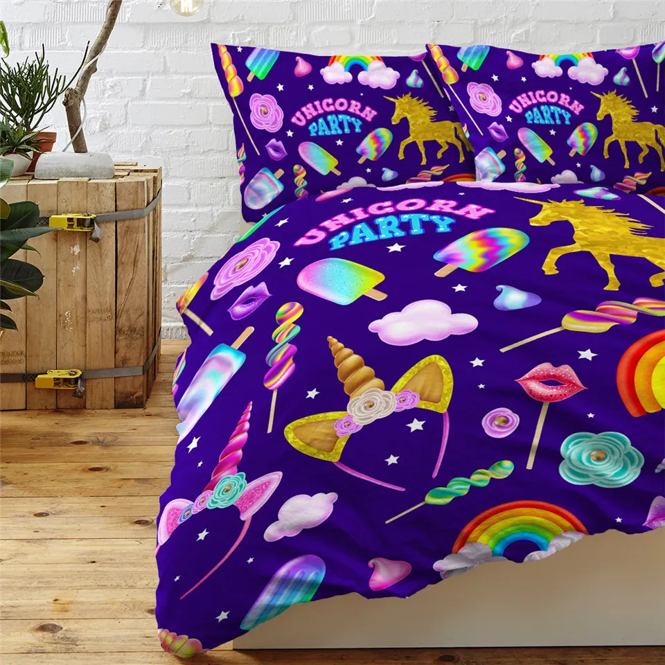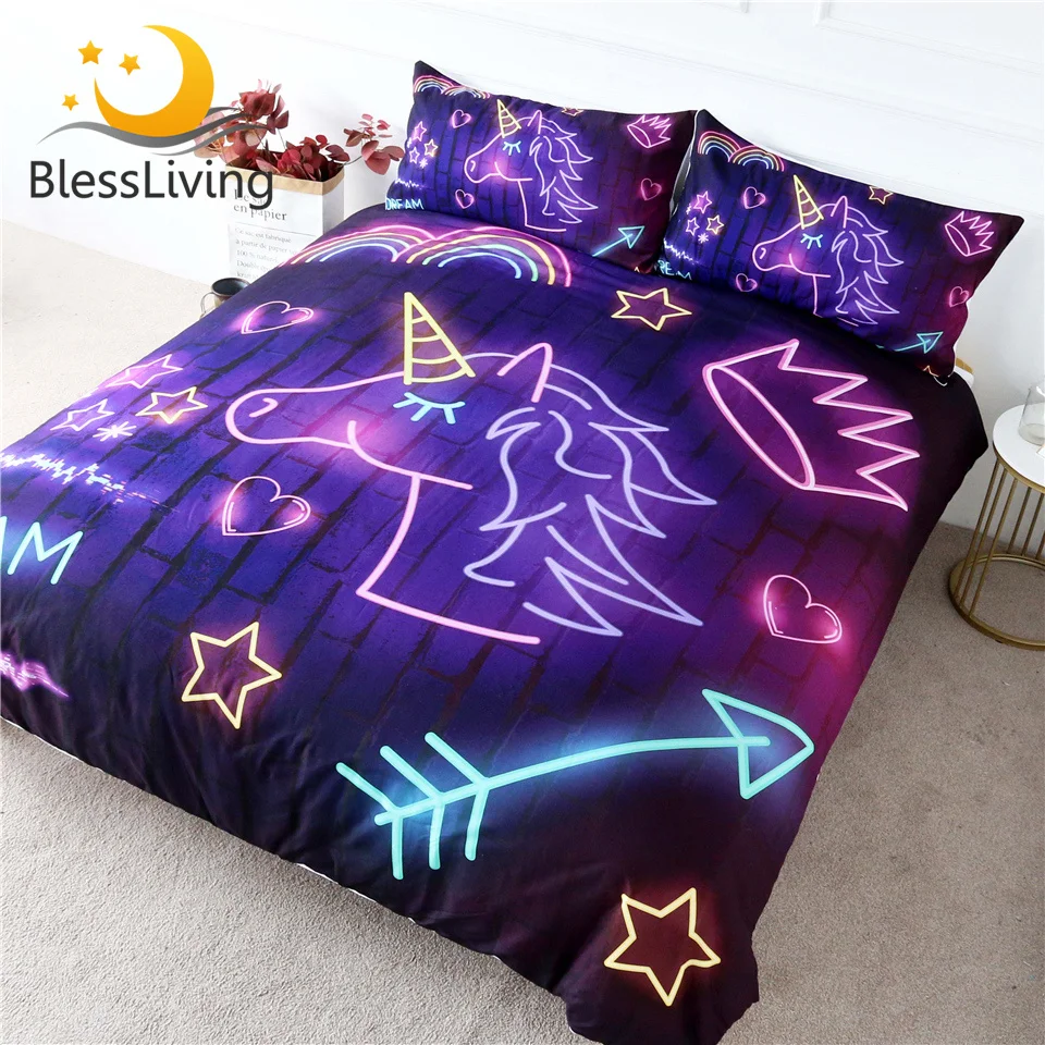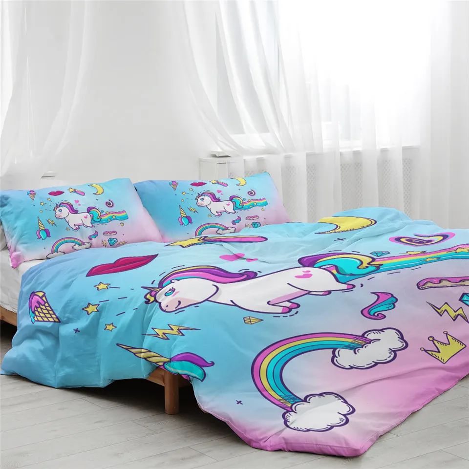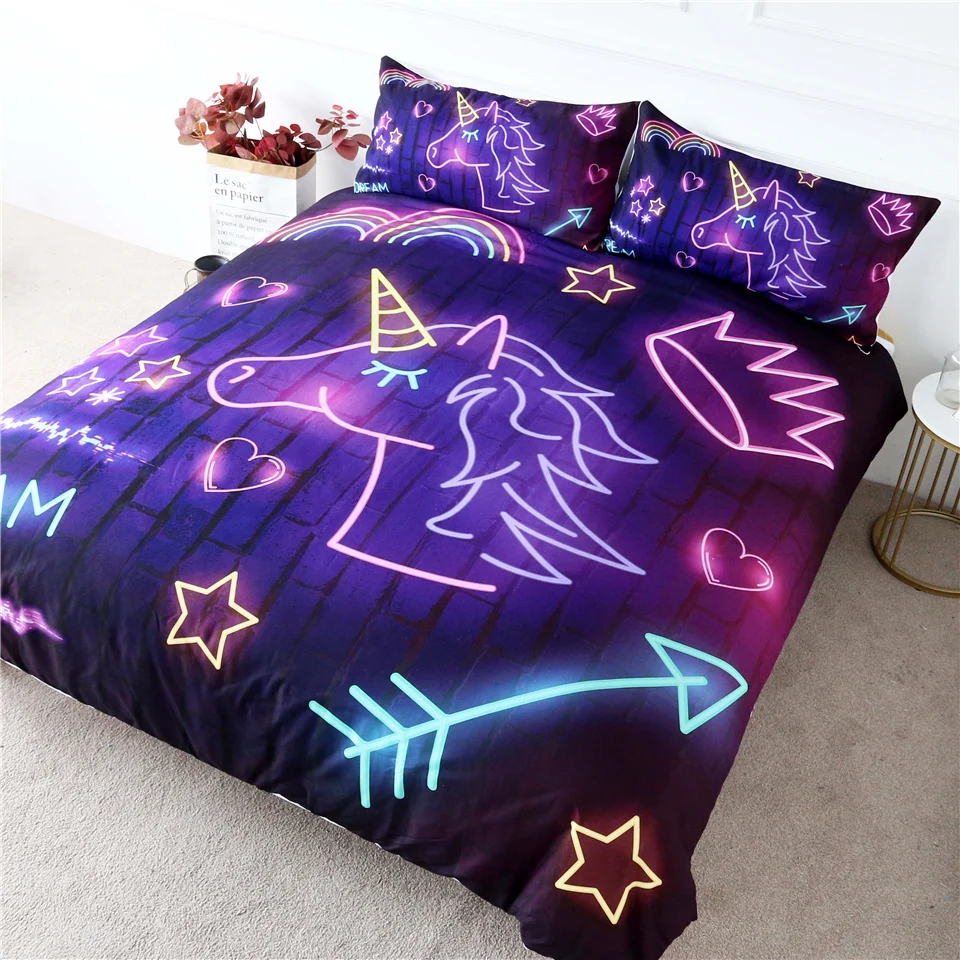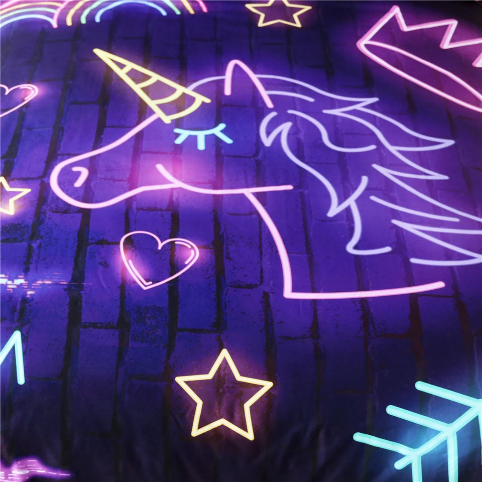 Детский комплект постельного белья из 3 предметов, пододеяльник с разноцветными радужными покрывалами, Корона и неосветильник свет, постельное белье с изображением единорога
