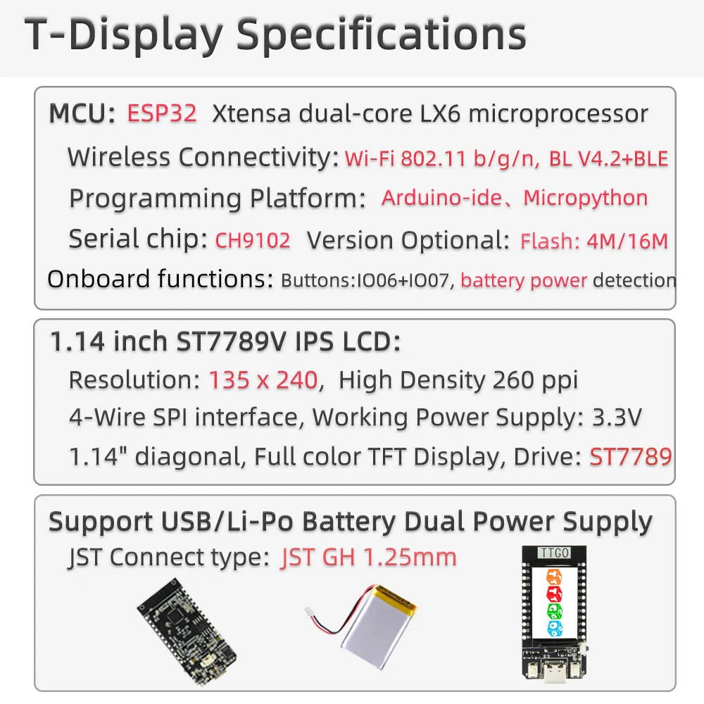 Хорошая упаковка и быстрая доставка. Мой модуль T-Display был в пластиковой коробке/чехле и поролоновой прокладке, чтобы защитить его от повреждений при транспортировке. Также в комплект входят штыревые разъемы и короткий JST кабель для подключения к подходящему аккумулятору. Одна вещь, которую я хотел бы увидеть,-это выравнивание цветного экрана, поскольку он не выровнен с остальной доской и из-за этого очень сложно установить в корпус как «Окно» Поскольку экран должен быть выровнен, или кнопки будут выровнены в корпусе, если я установлю модуль с экраном в его правильном выравнивании. Это единственный негатив, который я могу найти в этом модуле, и надеюсь, что LilyGO сможет улучшить установку/позиционирование экрана в будущем.