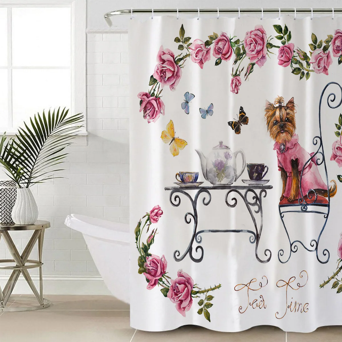 Занавеска для душа, водонепроницаемая, с изображением собаки, йоркширского терьера и розовых роз