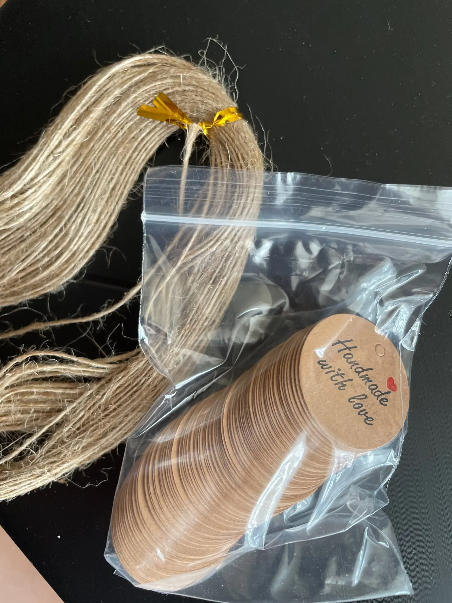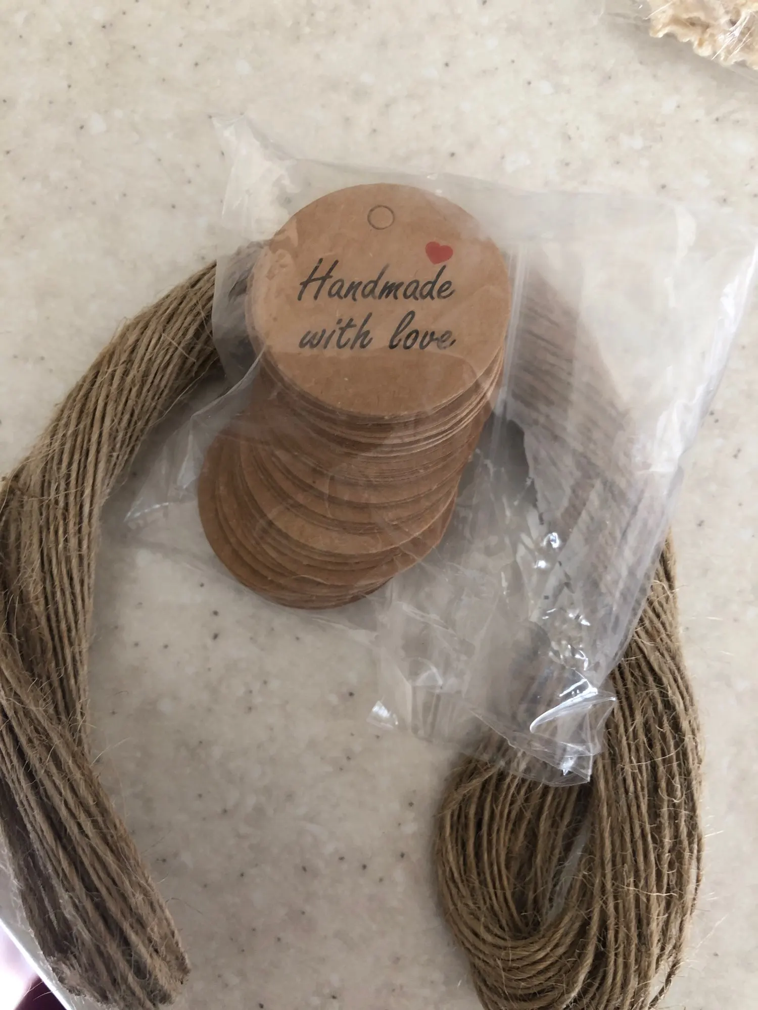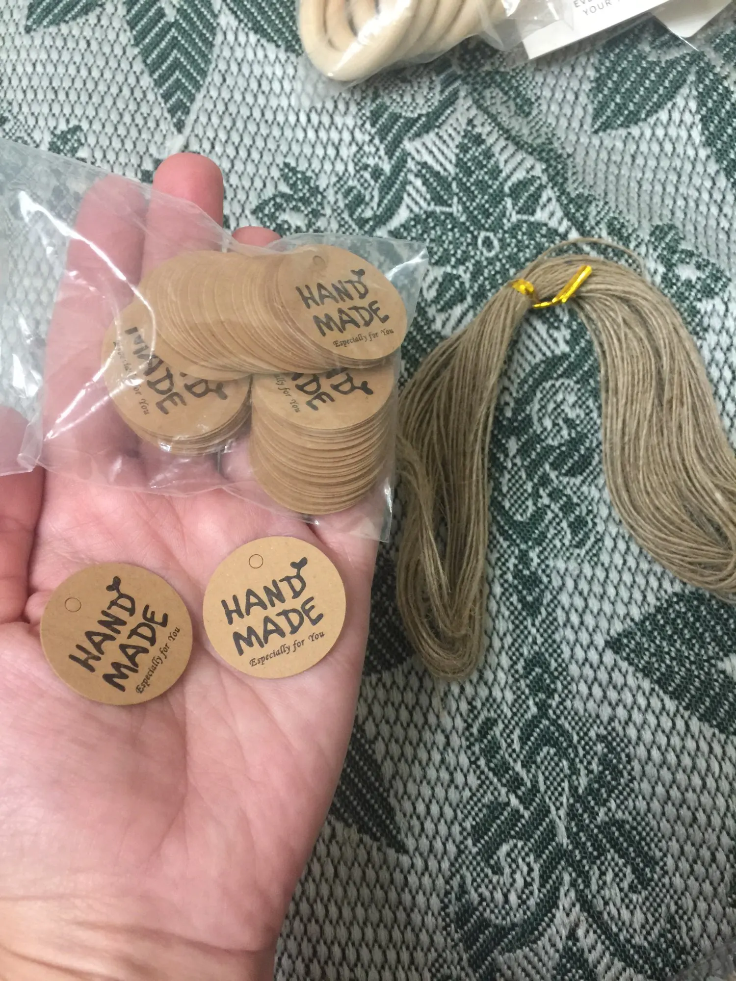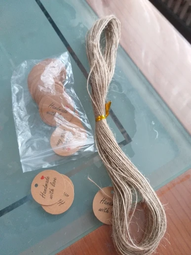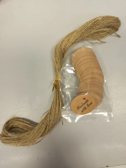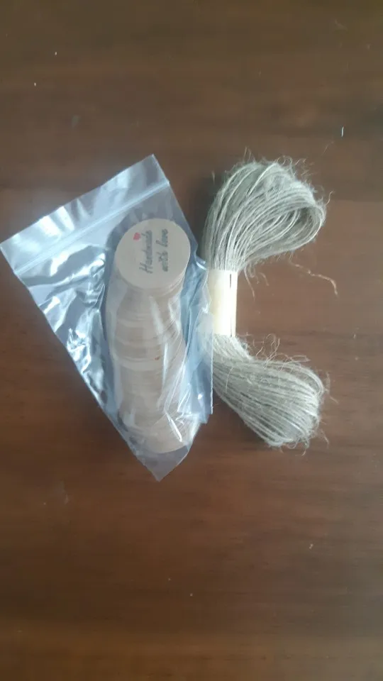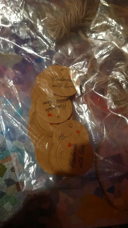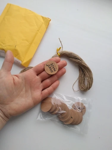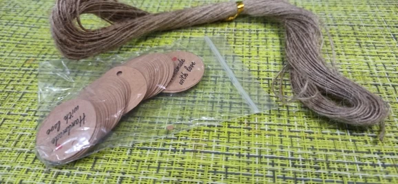 Заказ дошел очень быстро, в МО около недели. Забрала в пункте выдачи в 5-ке. Бирочки симпатичные) веревочки в комплекте)