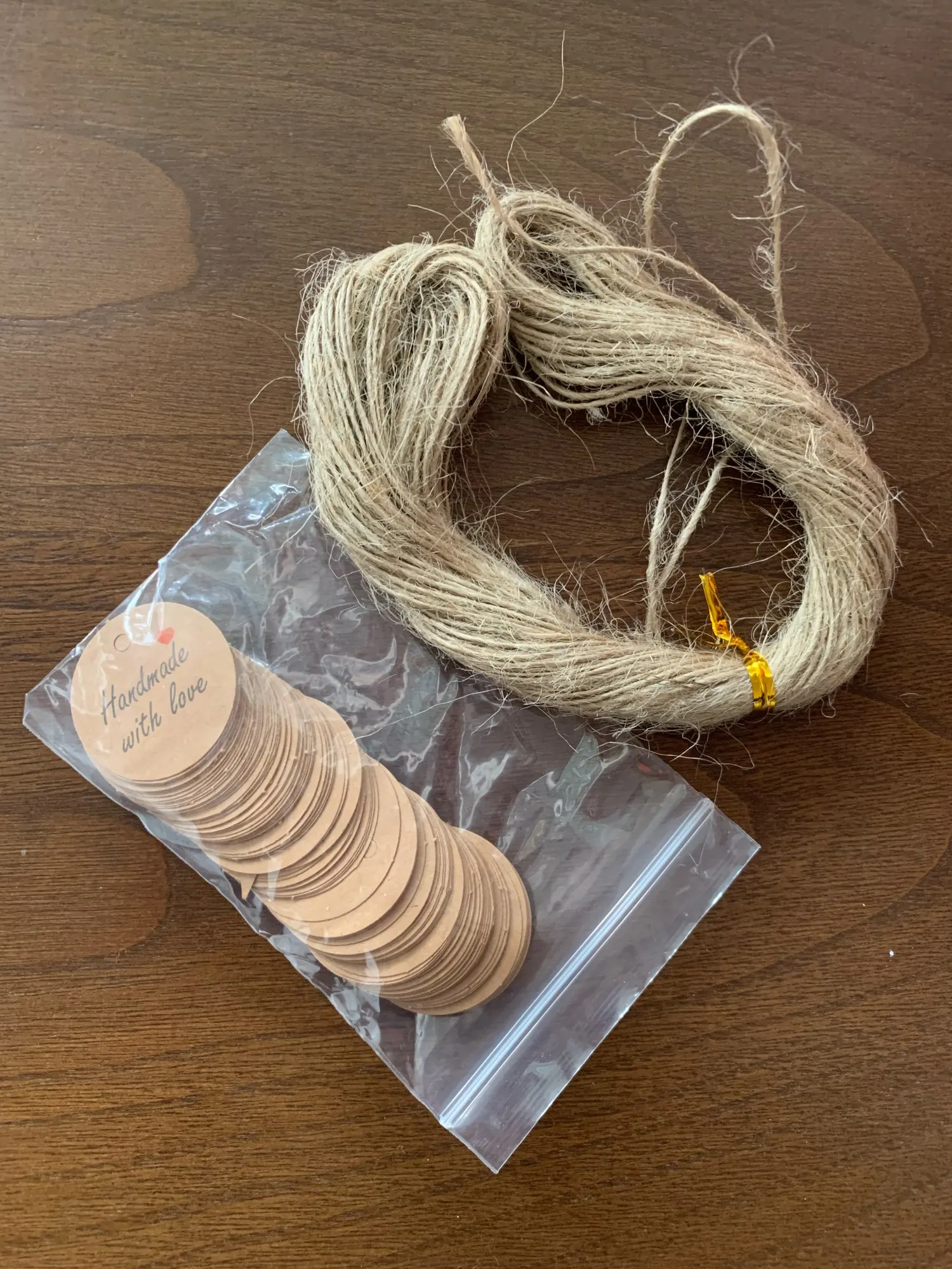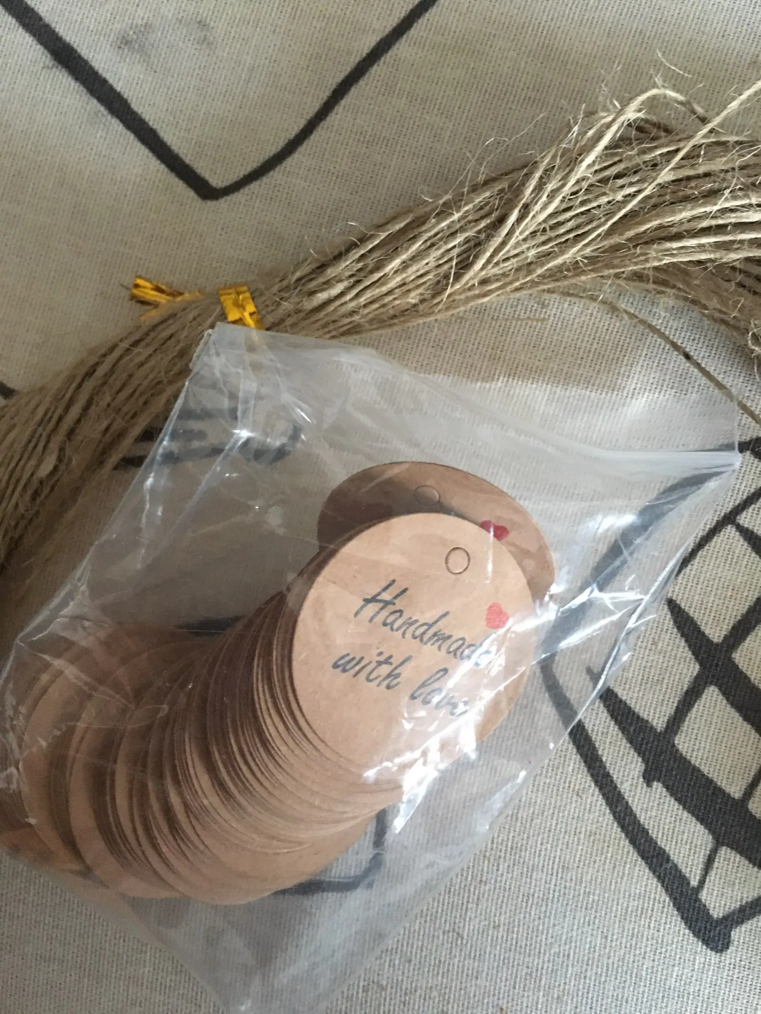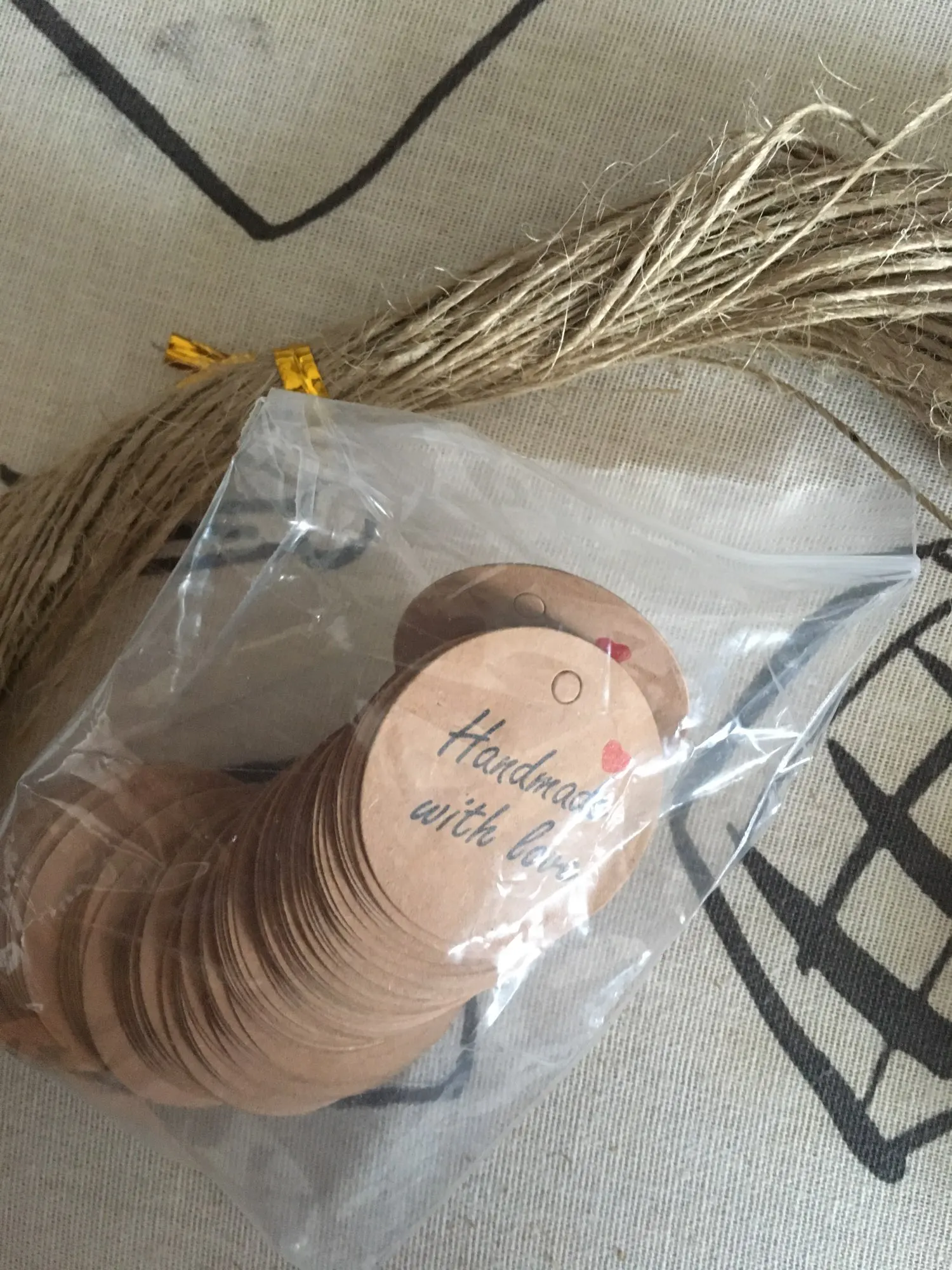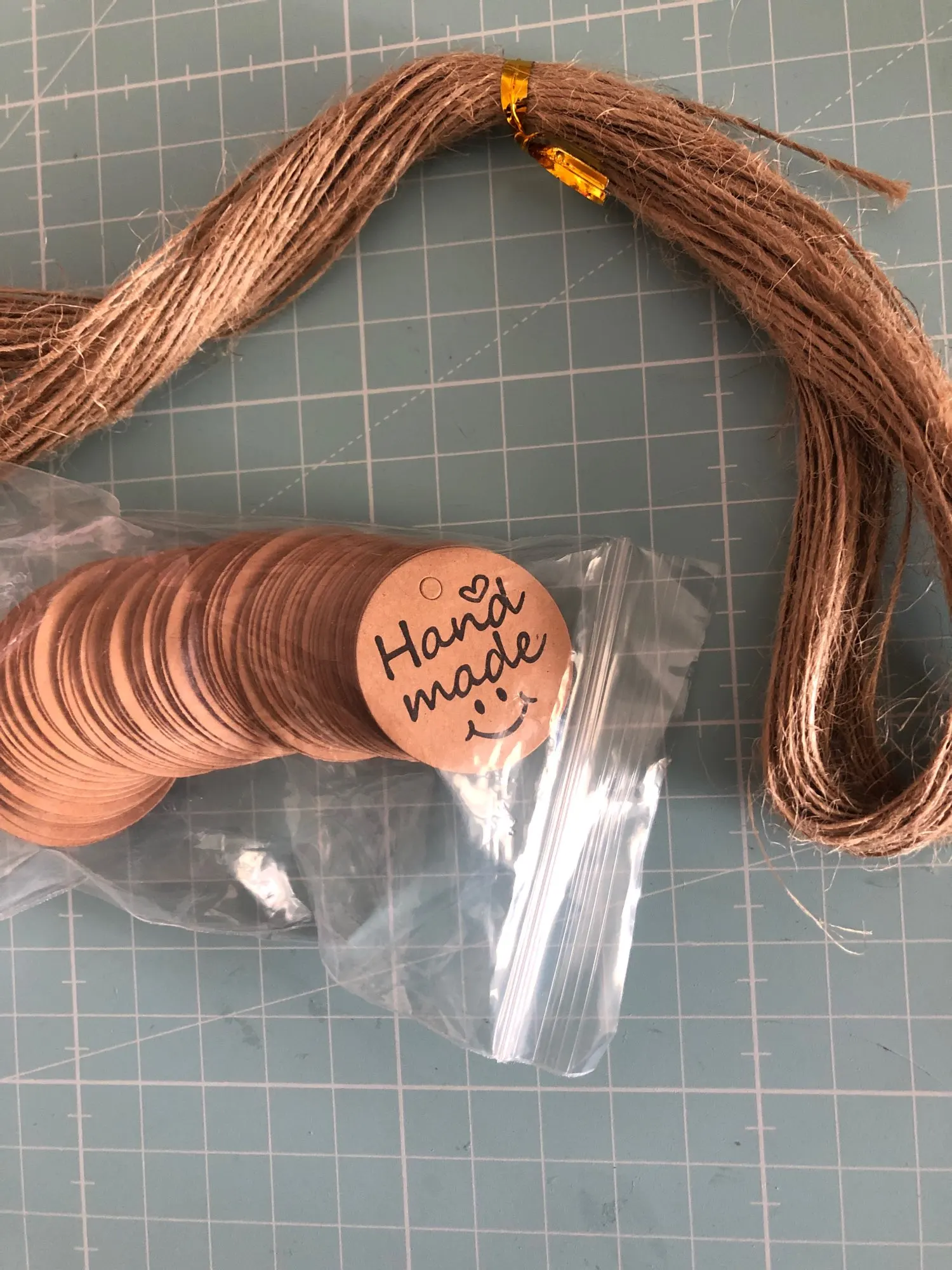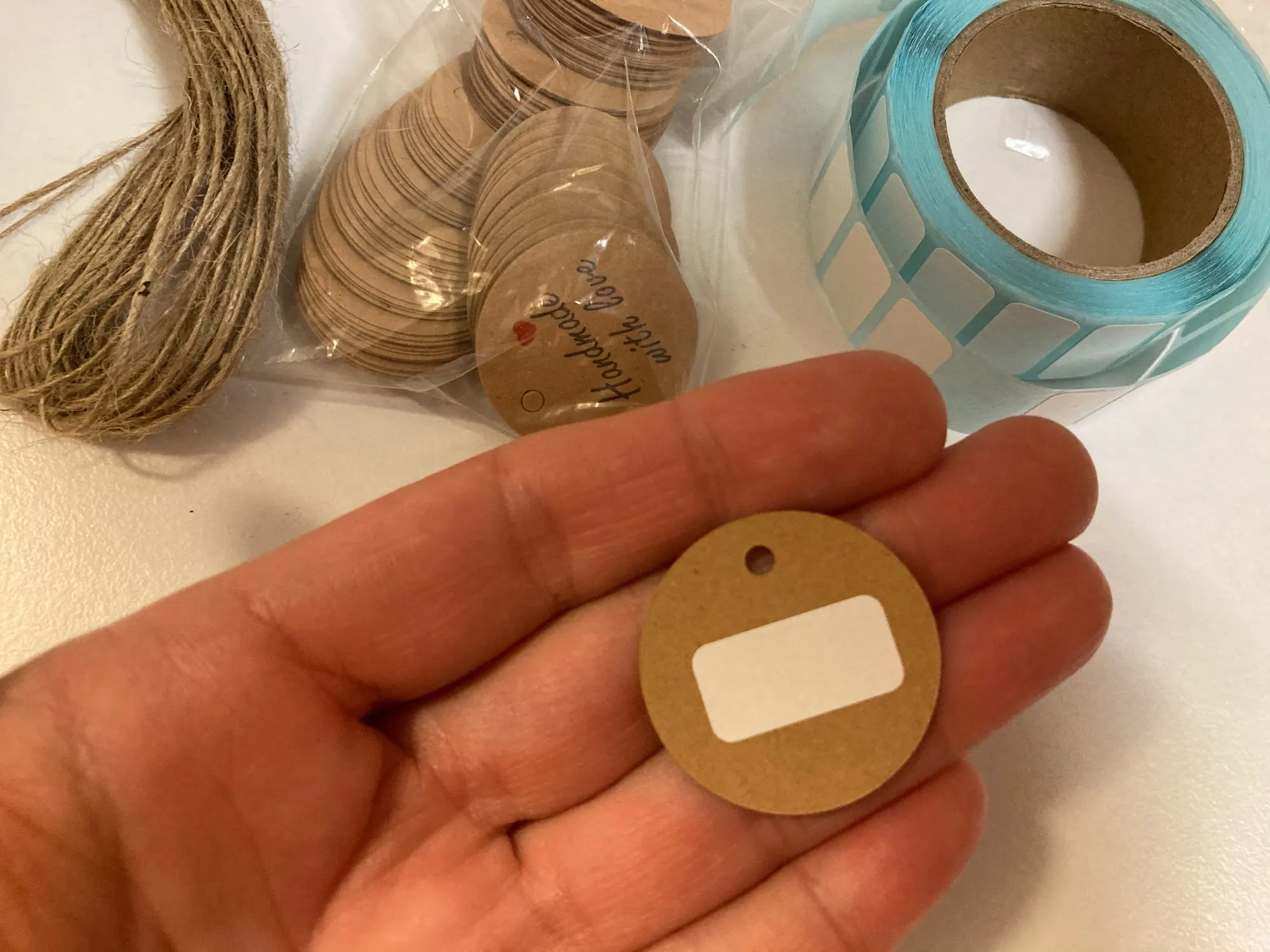 Заказ дошел очень быстро, в МО около недели. Забрала в пункте выдачи в 5-ке. Бирочки симпатичные) веревочки в комплекте)