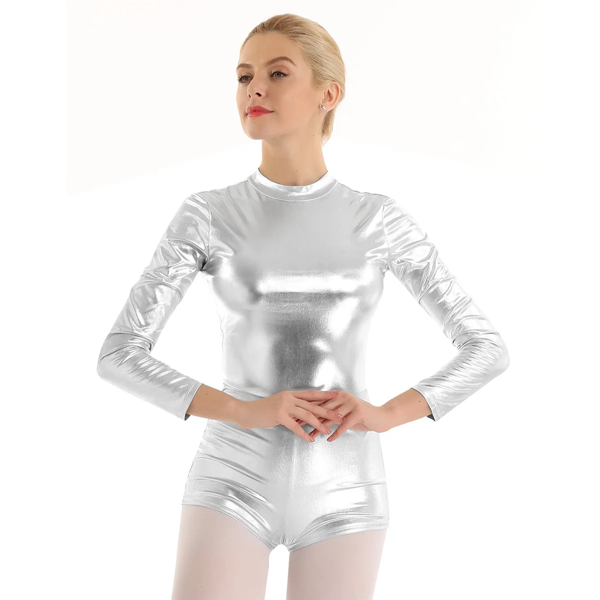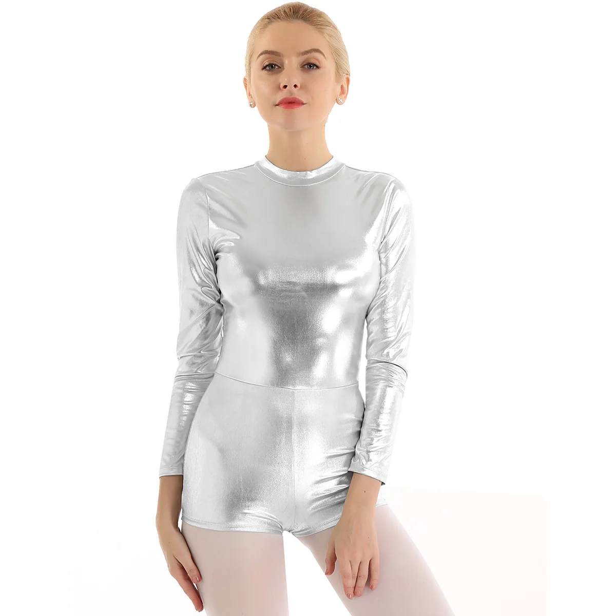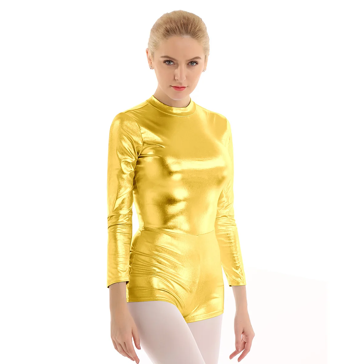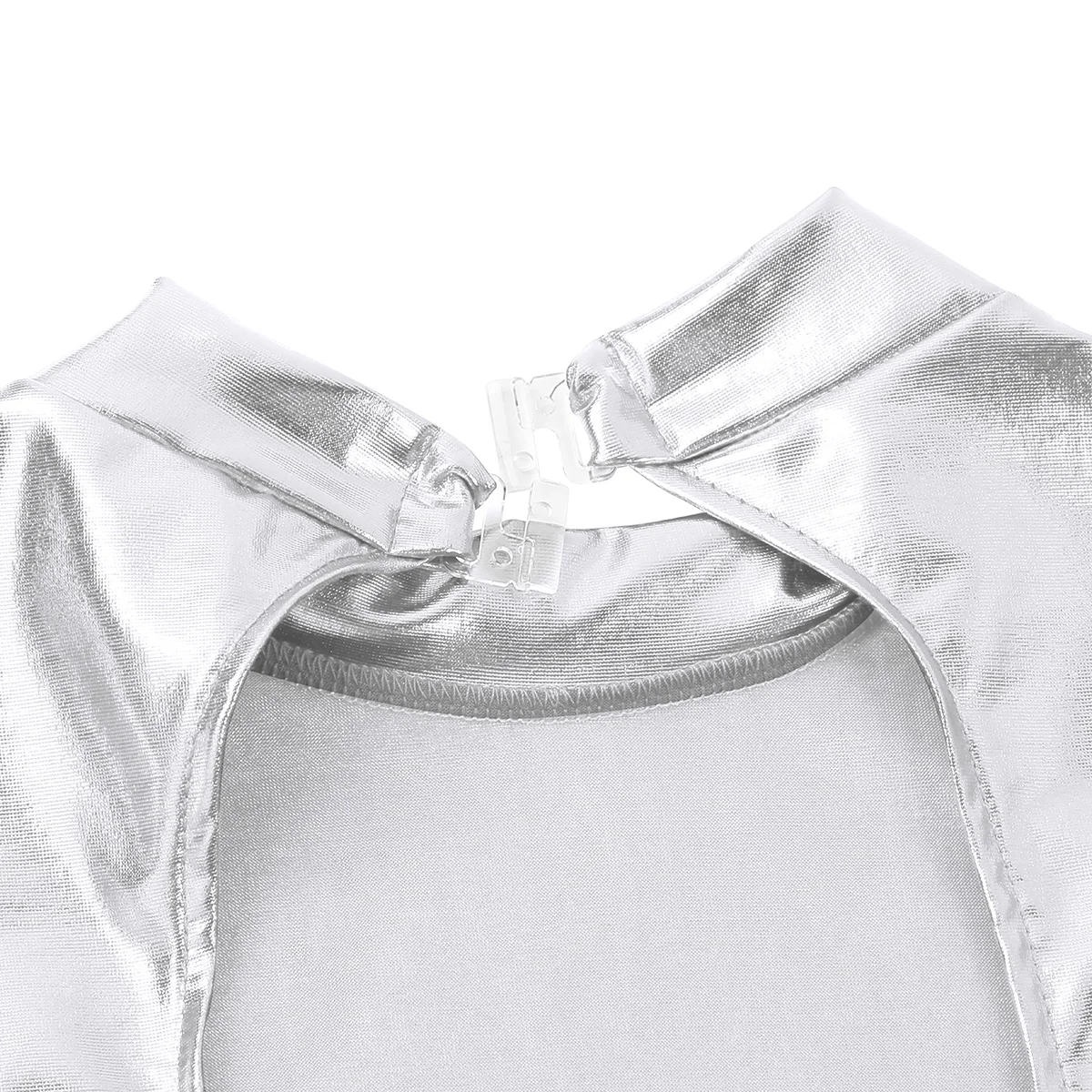 TiaoBug Блестящий металлический гимнастический купальник с длинными рукавами, женский костюм для фигурного катания, балетный костюм для взрослых, боди