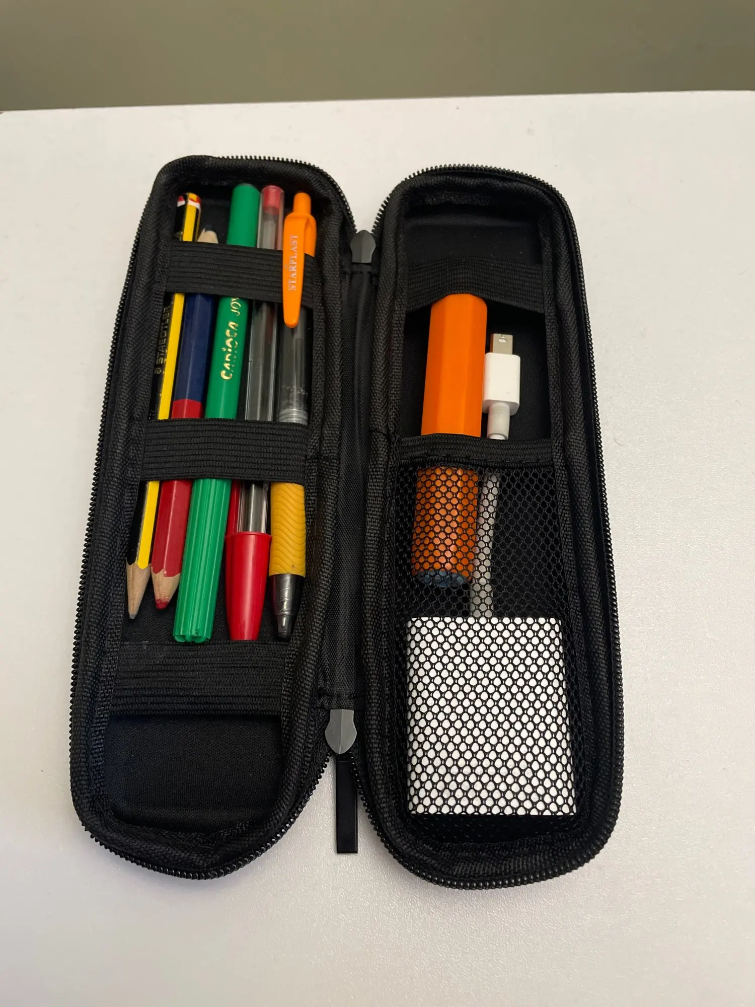 отличный пенал нужен был именно черный и для небольшого количества предметов влезло 5 ручек на одну сторону и разная канцелярия на другую (линейка, ластик и тд)