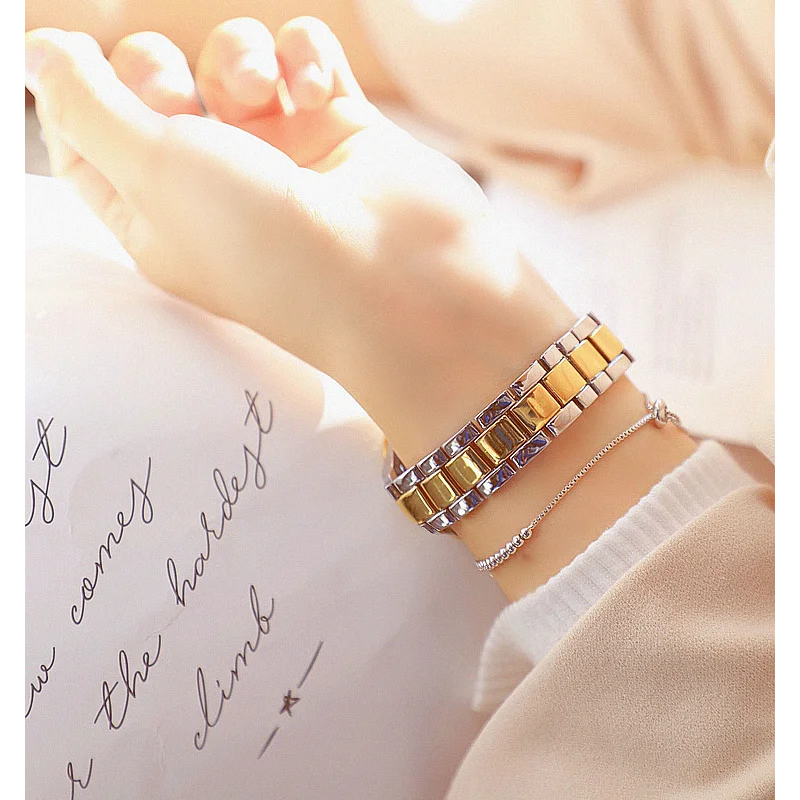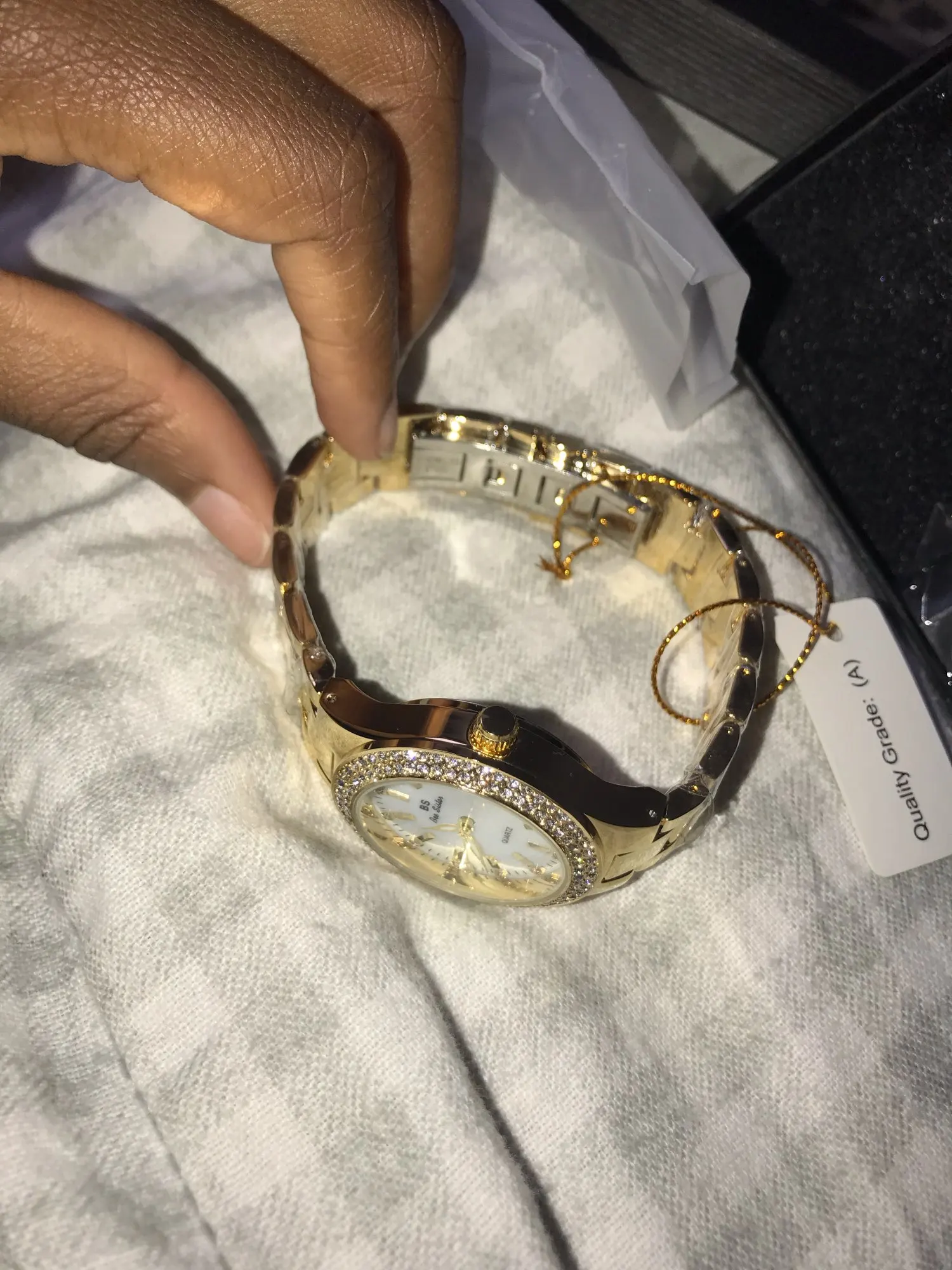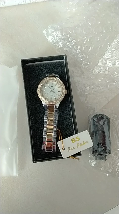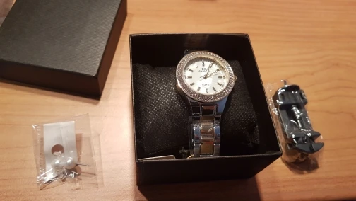 Часы пришли примерно за три недели, были упакованы в черную коробочку, обернутой двумя слоями пупырки, пришли целые, без царапин! Браслет был дополнительно обернут пленкой, часы тикают, внутри уже имеется батарейка, что очень важно! Также в коробочке была маленькая машинка для удаления секций с браслета, она рабочая, я удалила 4 секции и подогнала часики по размеру!