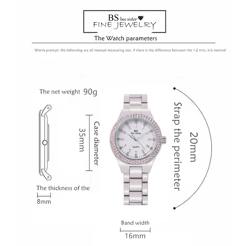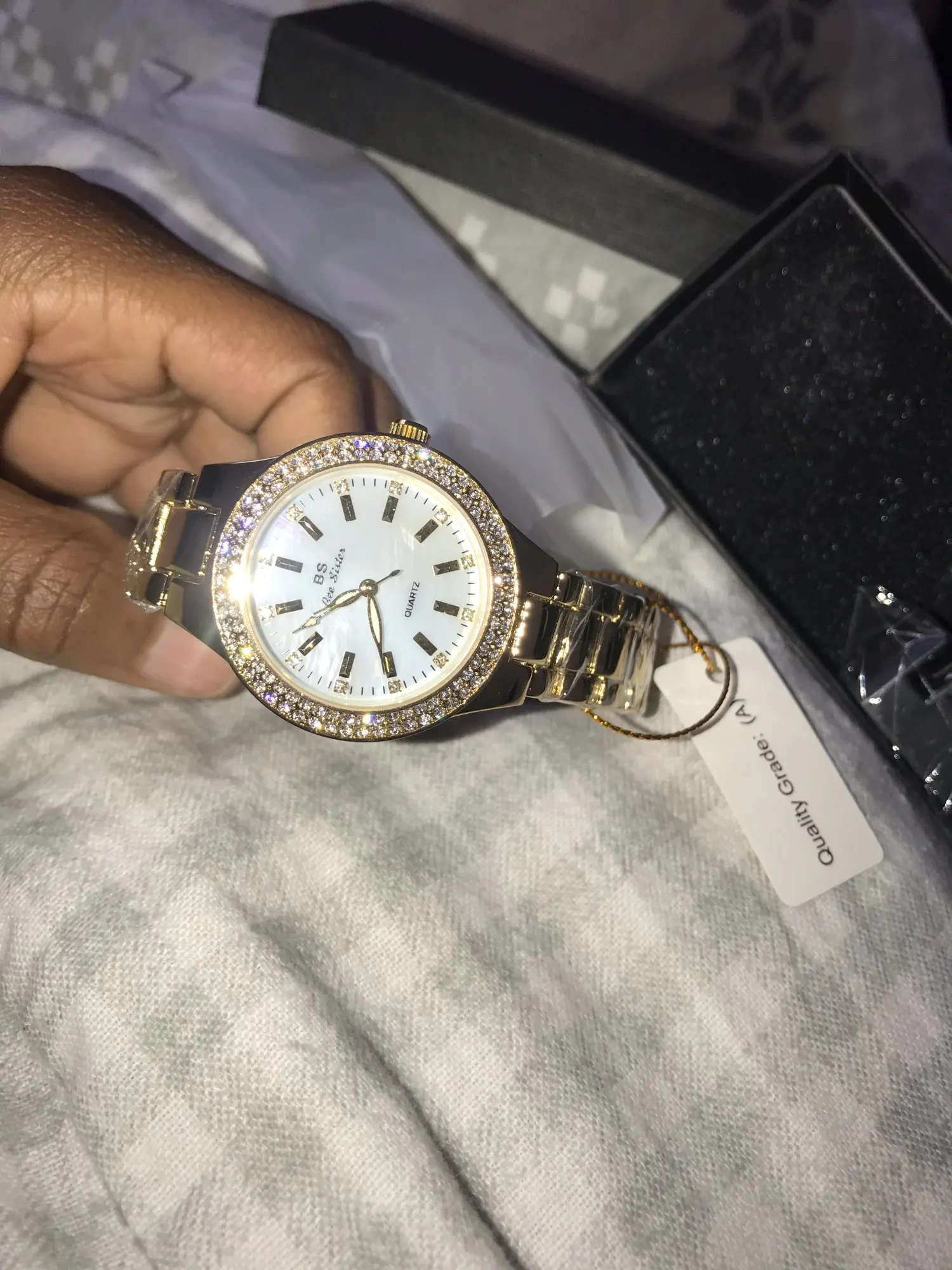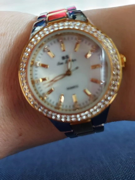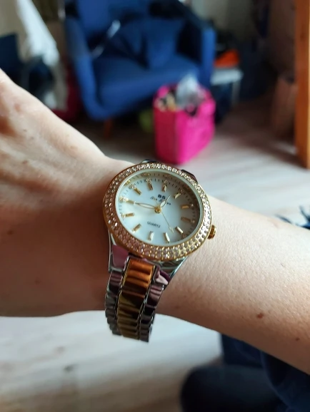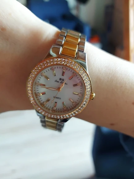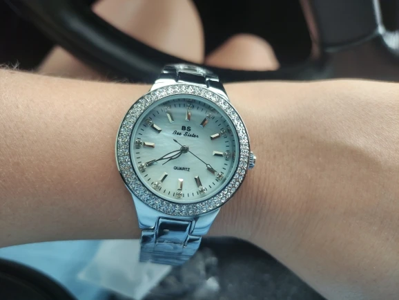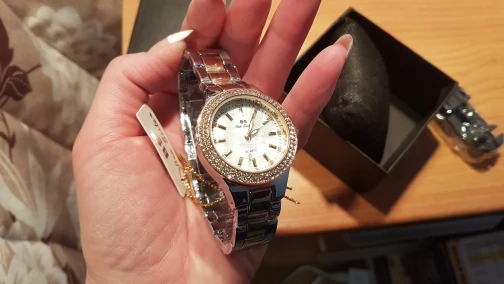 Товар производит очень приятное впечатление, начиная от упаковки и коробки (были замотаны в несколько слоев пупырок), заканчивая самими часами и приятными бонусами в виде сережек и прибора для уменьшения браслета. Часы блестят неимоверно, очень жаль, что на фотографиях не видно этого блеска. Помимо камушков изюминку придает и сам циферблат - он какой-то нежно-перламутровый. Что касается размера, то на любителя - это далеко не изящные маленькие часики