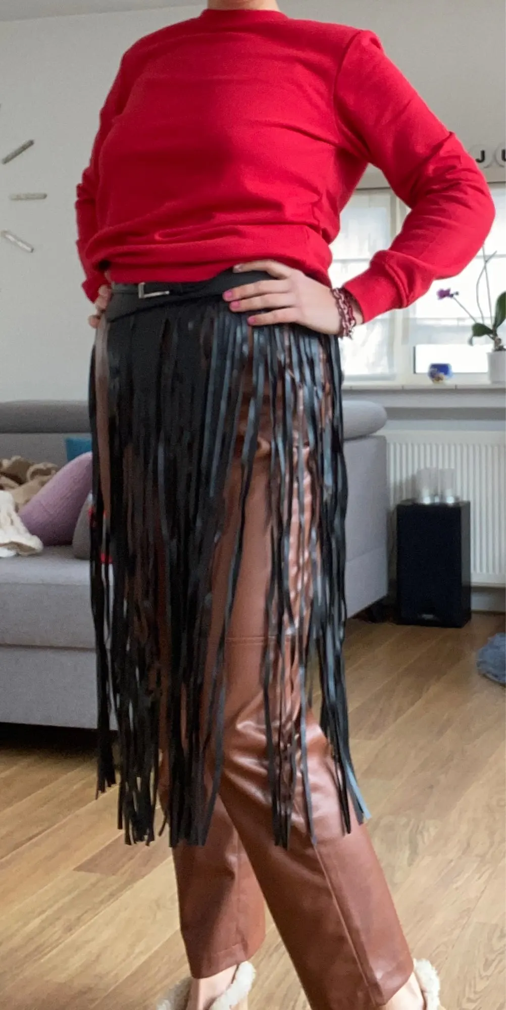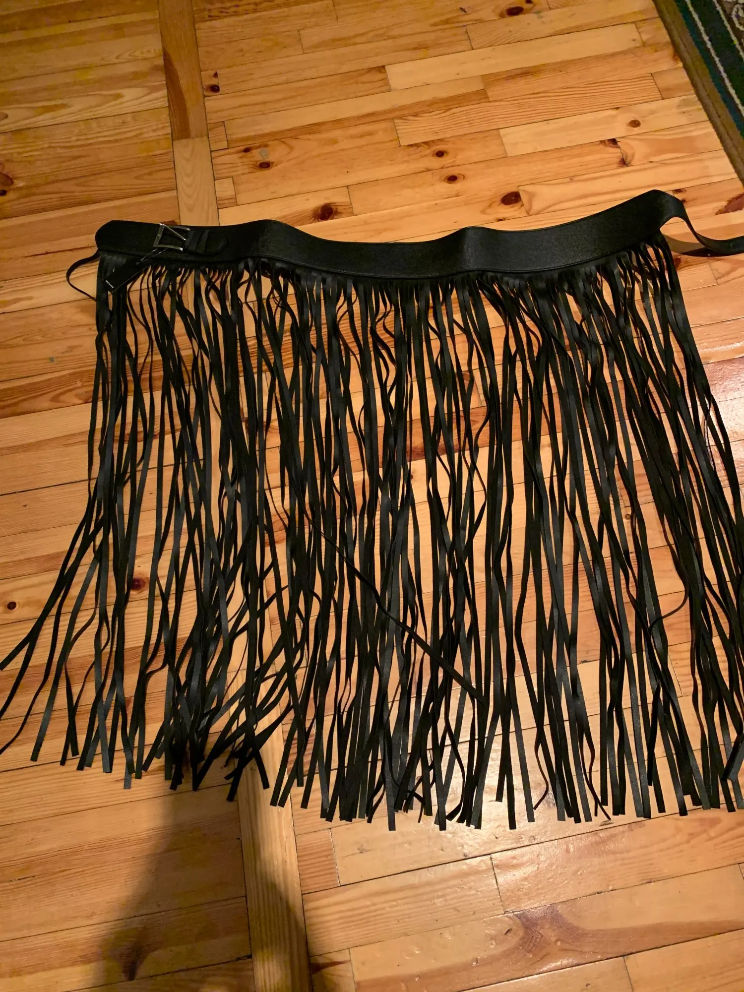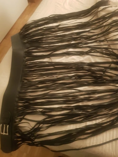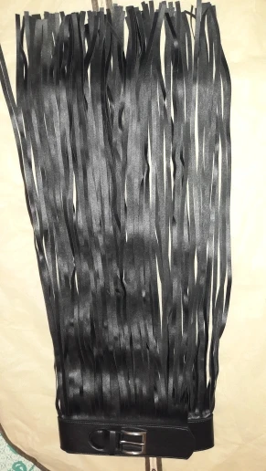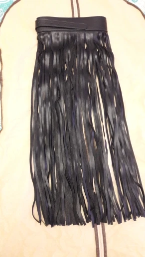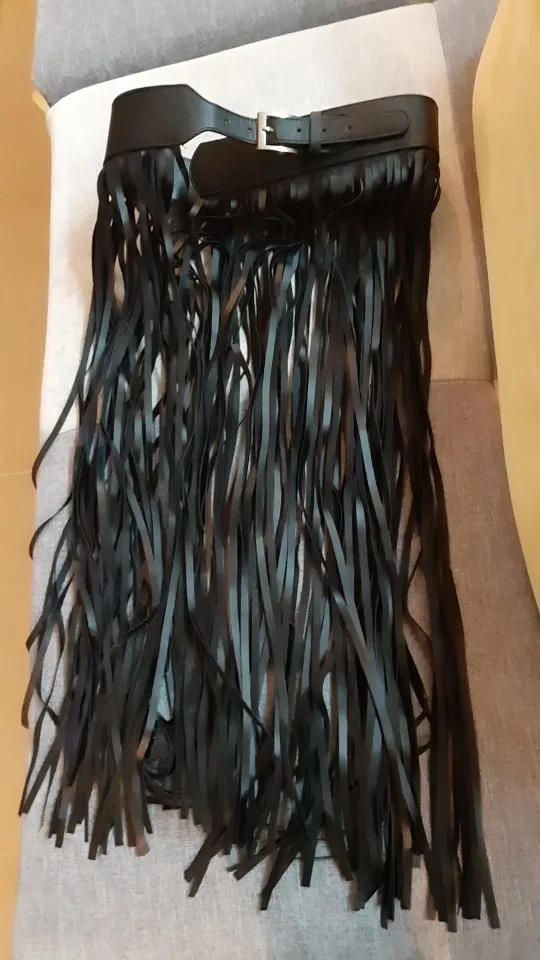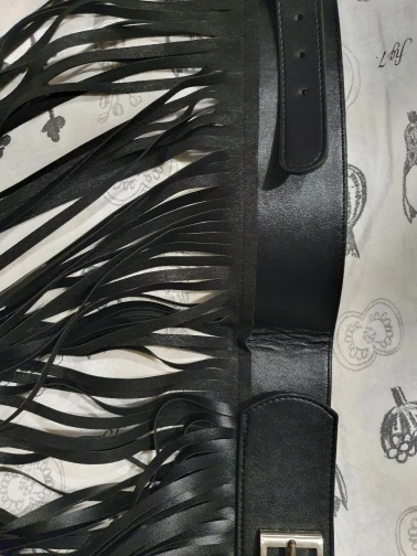 Натуральный дермантин. Чтобы бахрома закрывала полностью окружность, талия должна быть 72-86см. Обратная сторона бахромы не "кожа", прицепляется к одежде, приходится постоянно поправлять.