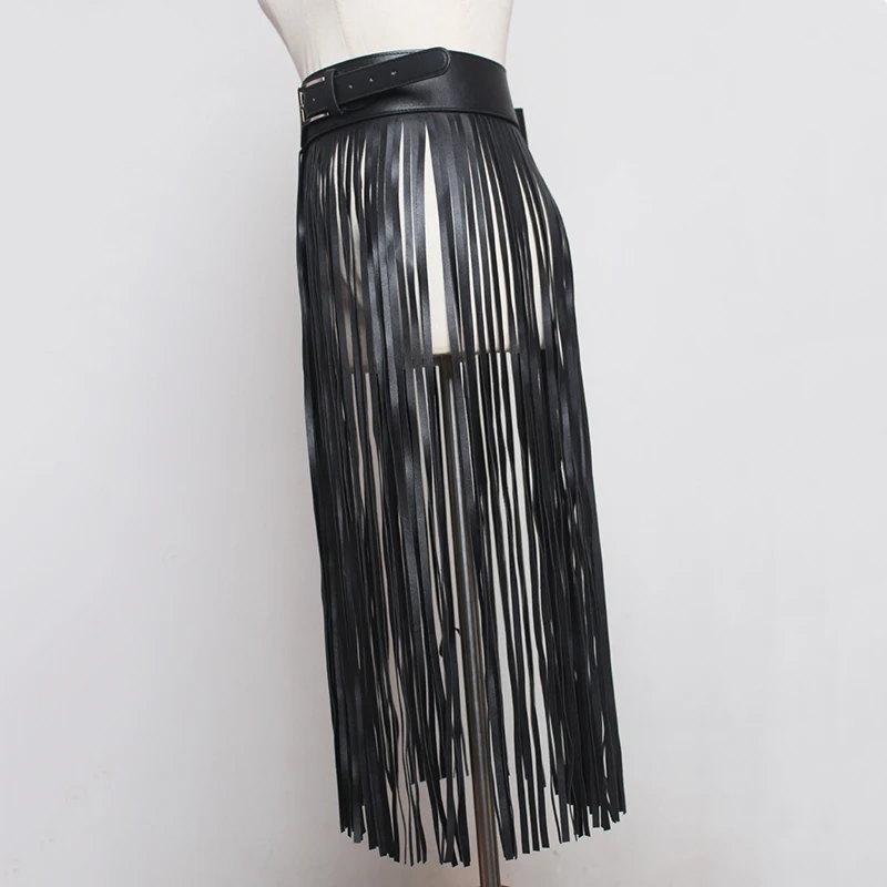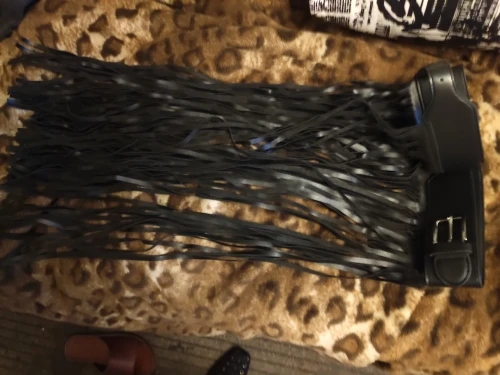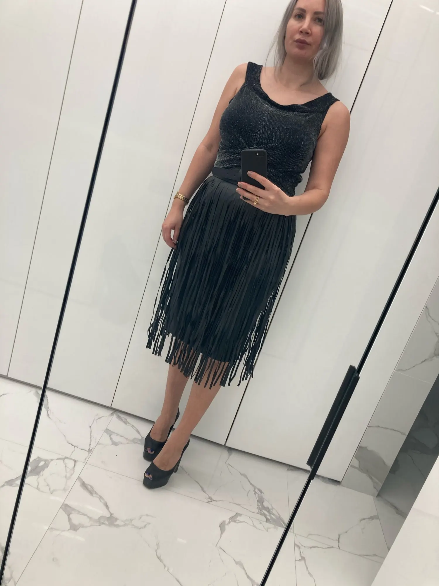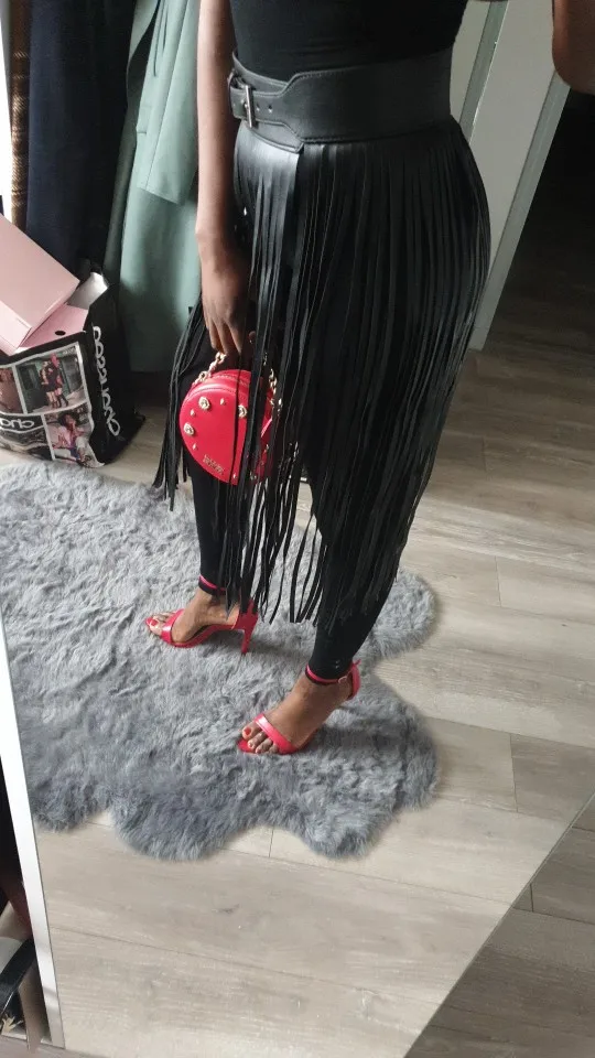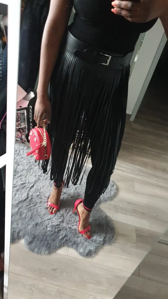 Натуральный дермантин. Чтобы бахрома закрывала полностью окружность, талия должна быть 72-86см. Обратная сторона бахромы не "кожа", прицепляется к одежде, приходится постоянно поправлять.