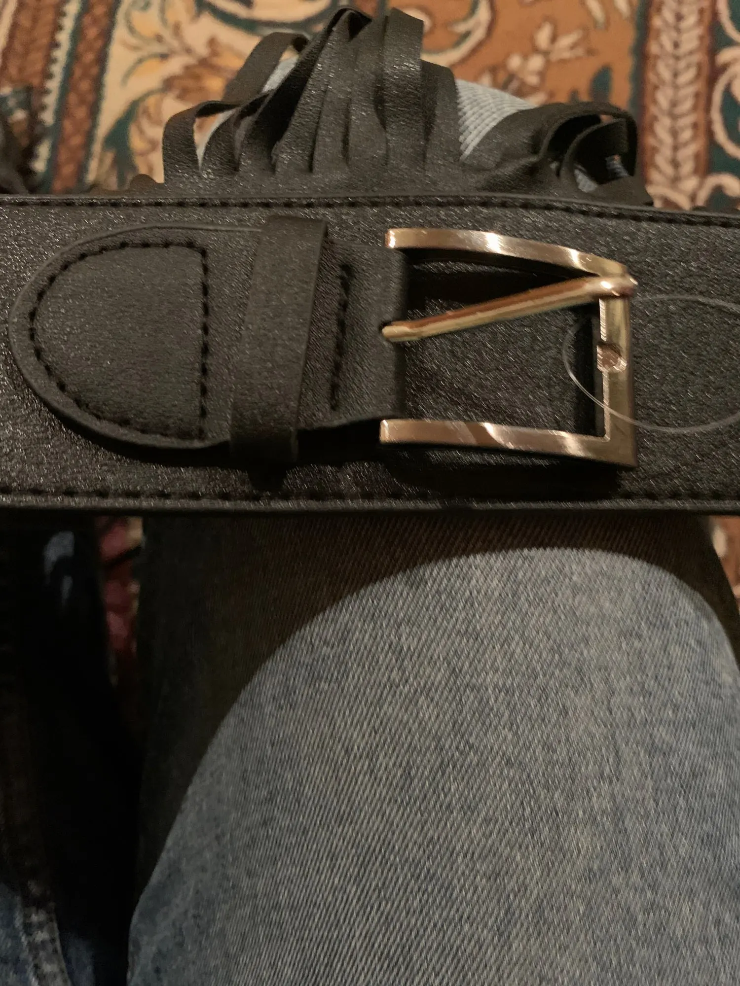 Пришёл помятый, надо попробовать отпарить. Выглядит интересно, можно украсить подходящее платье или юбку. Чёрная не натуральная кожа, серебристая пряжка. На размер S надо пробить ещё 2 дырки на ремне, или хоть одну. Вегда думала, почему все пишут про запах, вот теперь поняла, первый раз пришла вещь с запахом Рекомендую.
