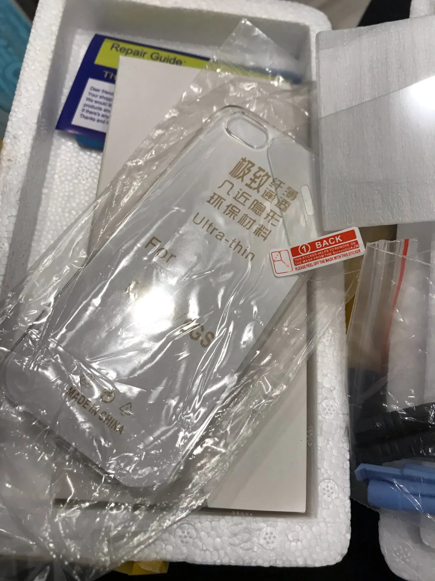Доставка до пункта выдачи-25 суток. В комплекте силиконовый чехол, защитное стекло, подставка и набор инструментов. Дисплей чуть толще оригинального.