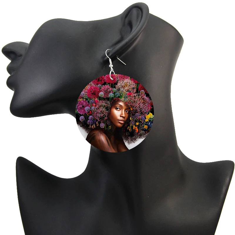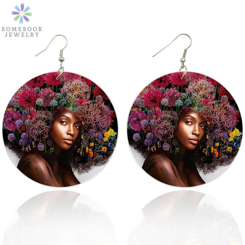 SOMESOOR с обеих сторон Картина черные женщины афро искусство Деревянный Висячие Серьги африканские натуральные волосы деревянные украшения для женщин девушки подарки