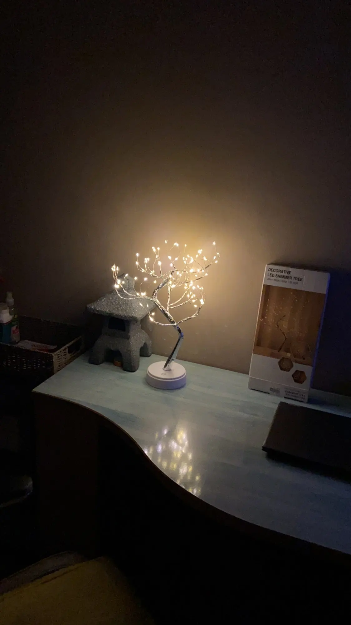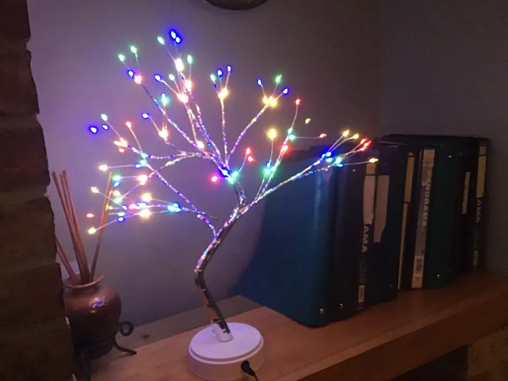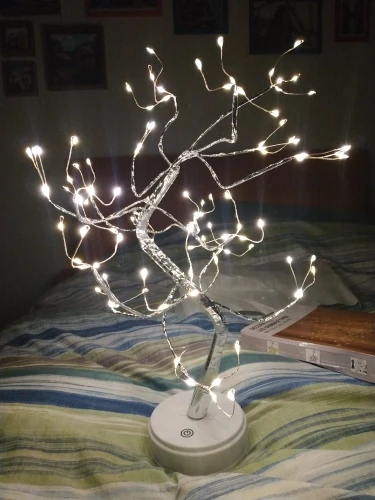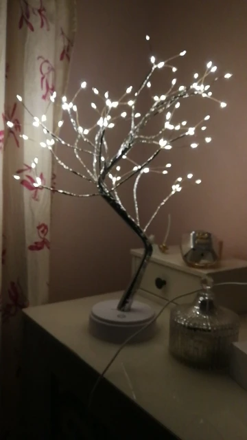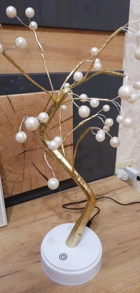 Выглядит в темноте неплохо, но при свете.... Само деревце как я думала будет из металла, но такое ощущение что оно из пластика, вокруг которого тонкие проводки, и все это просто обернуто золотым скотчем. На лампочках надеты пластиковые бусины, покрытые краской под жемчуг. По моему мнению этот Ночник не стоит этих денег. Брала по отзывам, но увы..