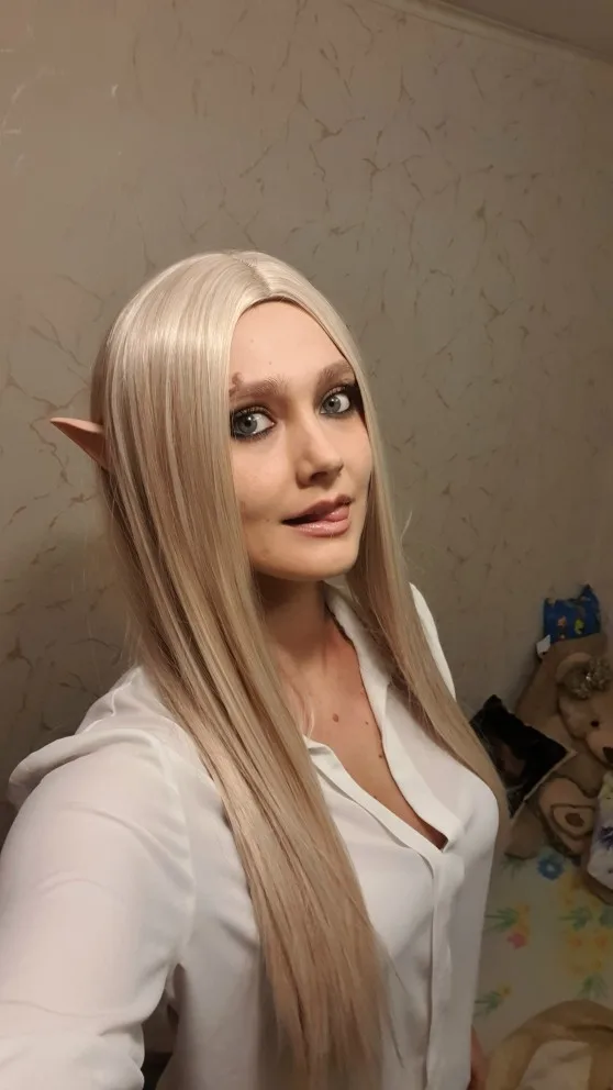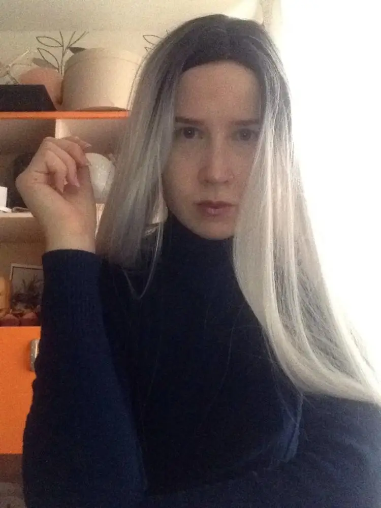 Парик красивый, но не чисто белый (есть светло коричневые пряди) ,немного магниться и сдавливает голову) пришел быстро