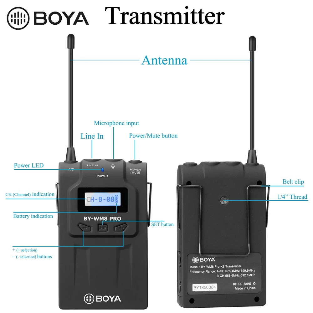Он BOYA BY-WM8 Pro-K2 обновленная двухканальная Беспроводная микрофонная система UHF Для захвата аудио с двумя предметами, оснащен простым в считывании ЖК-дисплеем, широким переключением полосы пропускания RF, PLL-synthesized тюнингом и цифровой схемой.