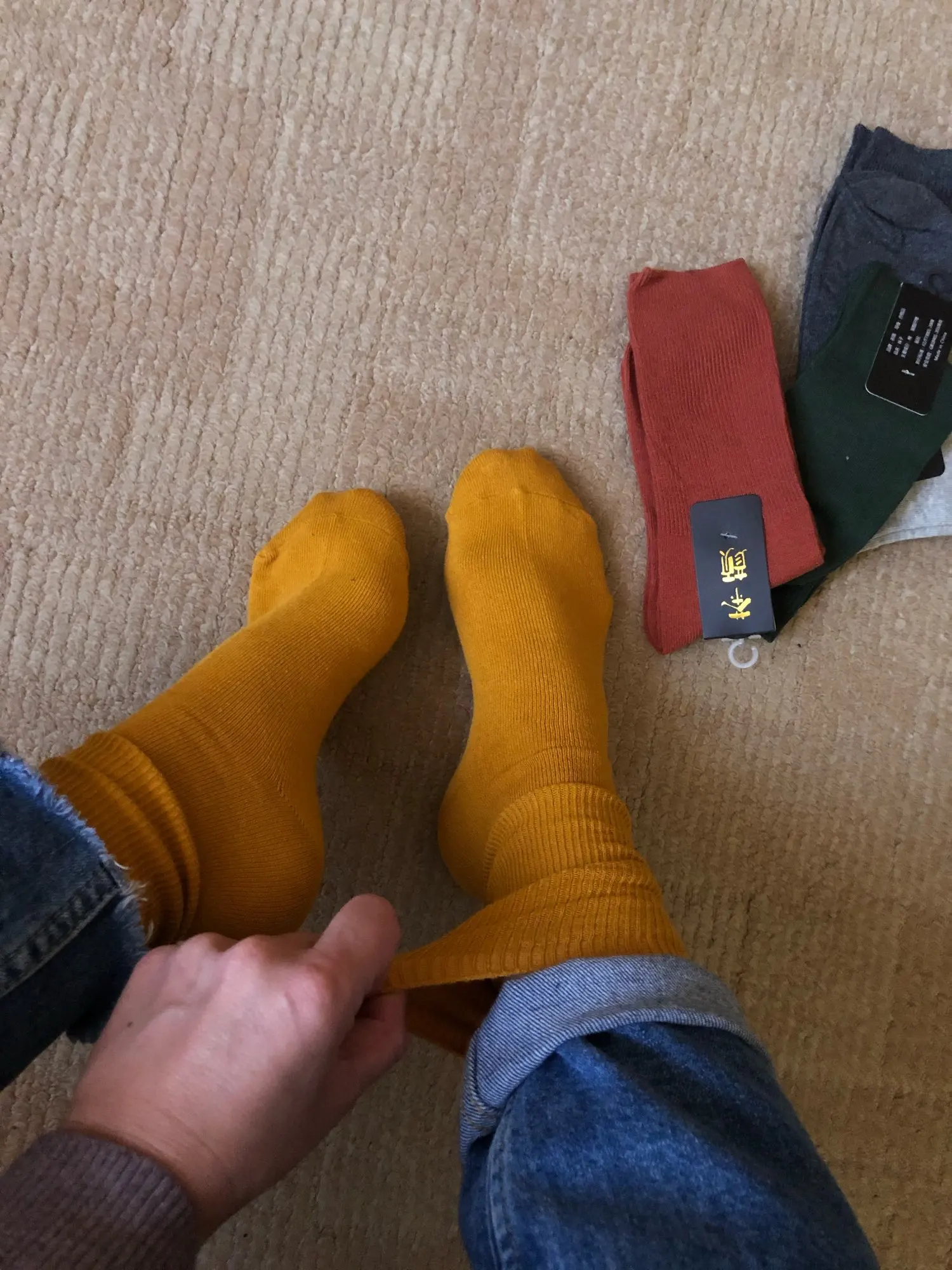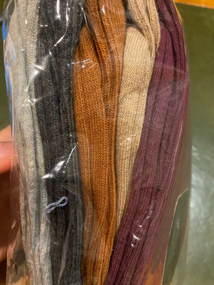 Носки отличного настроения качества. Попросила продавца положить определенные цвета. Вместо золотой положил коралловый (думаю издержки перевода). Белый цвет ближе к молочному