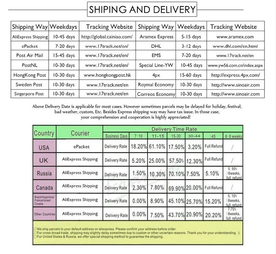 1. Когда мы получили информацию о вашем заказе и оплате, мы обычно 2-5 дней для завершения доставки, мы предоставляем информацию для отслеживания логистики. Однако из-за определенных факторов и региональных проблем, которые могут привести к задержке доставки, надеемся на понимание, время доставки обычно составляет 15-40 дней, пожалуйста, будьте терпеливы.