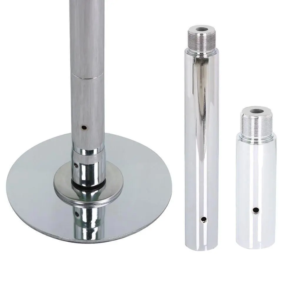 1. Цельная металлическая конструкция, полюс диаметром 45 мм, выдвигается на расстоянии 2,235-2,745 М. 2. Высококачественная гальванизированная хромированная отделка. 3. Соедините трубку с высокоточными соединениями (почти бесшовными) для максимальной прочности, стабильности и плавности. 4. Опорный купол с двойным шестом, равномерно распределяет нагрузку/давление по потолку, может нагрузить максимальный вес 200 кг. 5. Полностью съемный, портативный, вес нетто кг. 6. Может быть неподвижным или вращающимся, только затягивать или оттягивать винты. Посылка 2 * Главный Полюс 1*125 мм удлинитель 1*250 мм удлинитель 1 * Регулируемая Крышка 1 * нижнее основание 1 * Верхний купол 1 Набор установочных инструментов 1 * CD