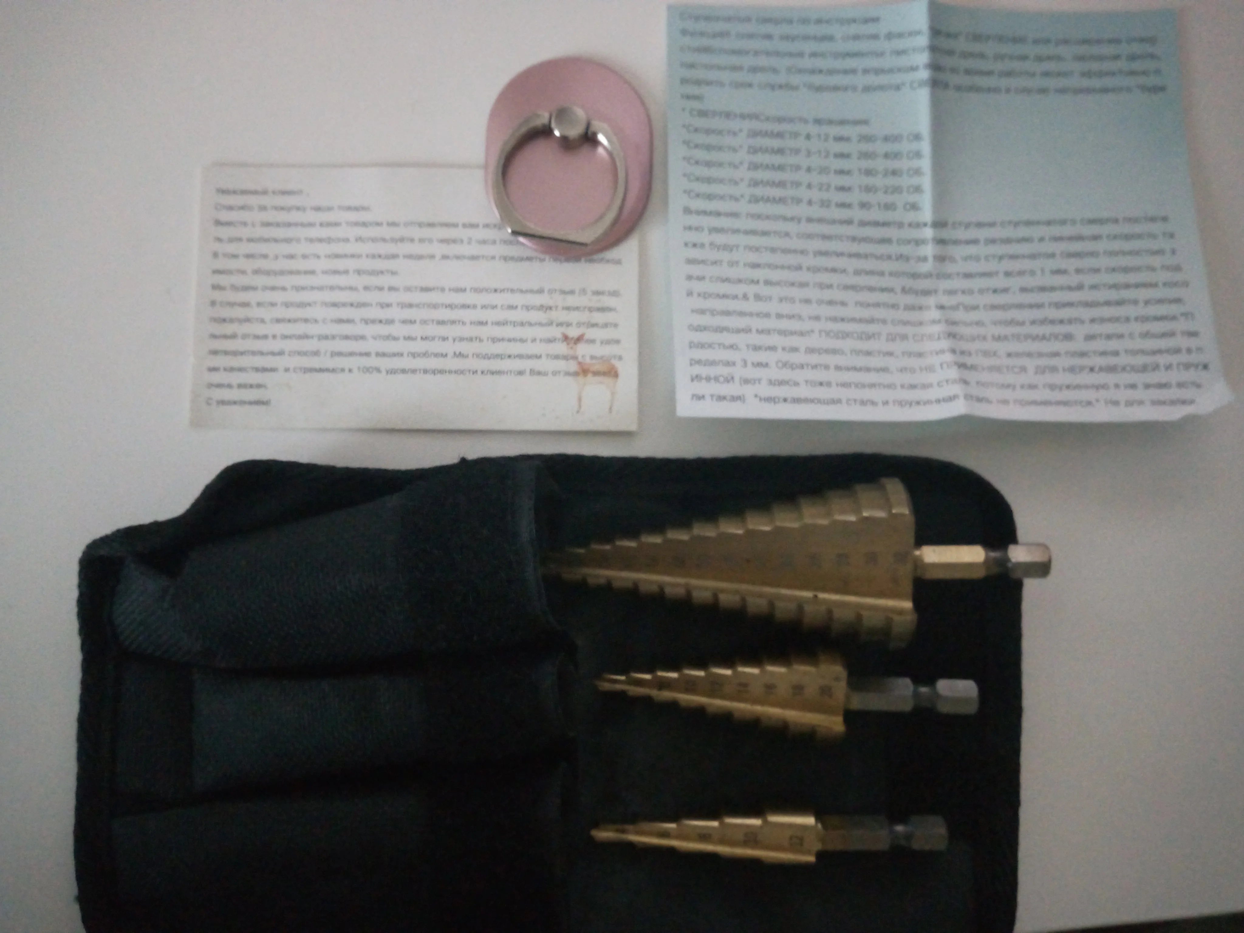 всё гуд, доставка нормальная, отслеживалась действительно крутые многоступенчатые свёрла:) так же отдельное спасибо за неожиданный подарок! браслет хорошего качества из паракорда спасибо!