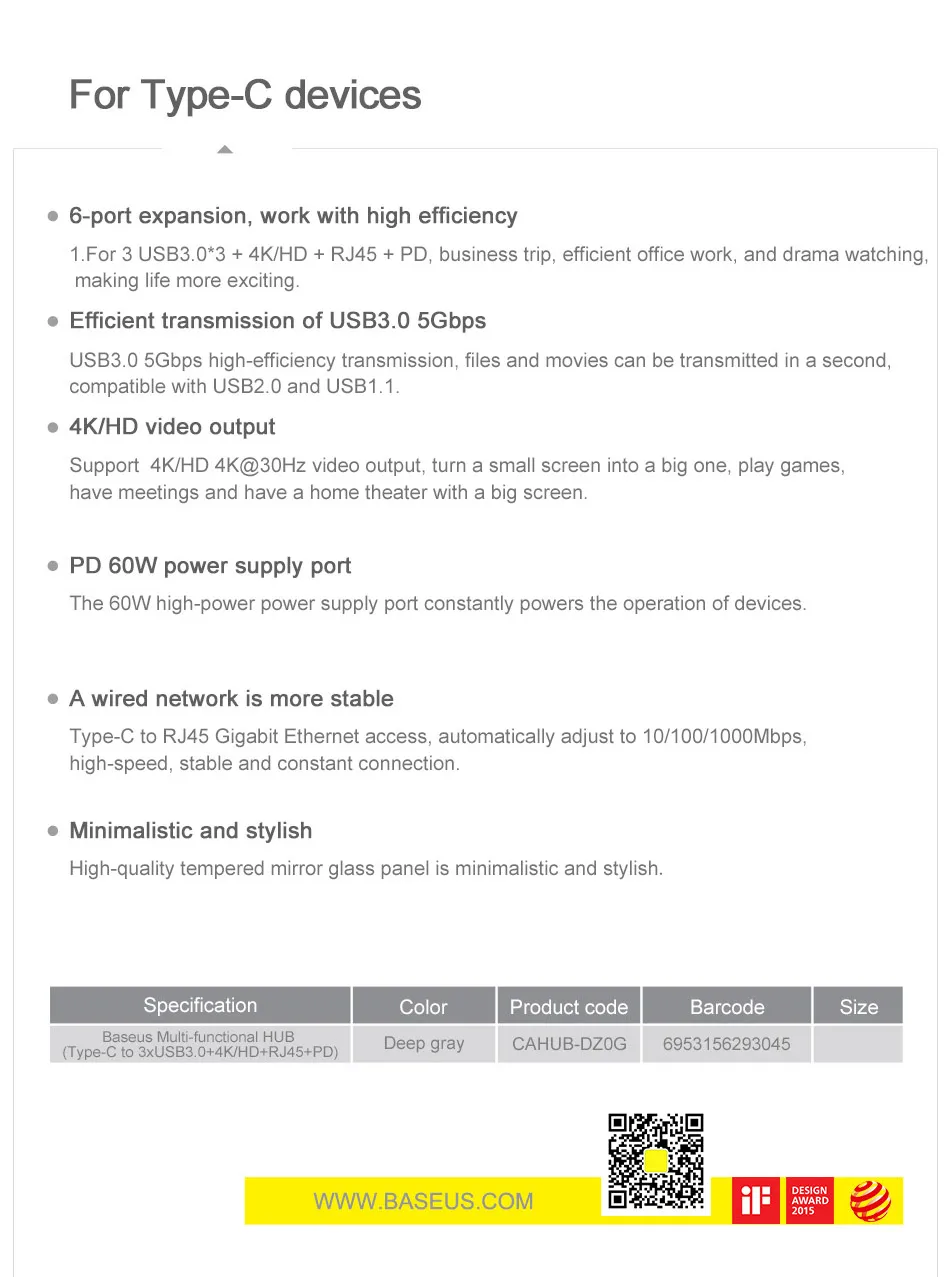 Baseus мульти usb хаб type C к HDMI RJ45 USB3.0 адаптер питания для MacBook Pro Air Dock 6 портов USB C usb разветвитель Hab переходник для компьютера