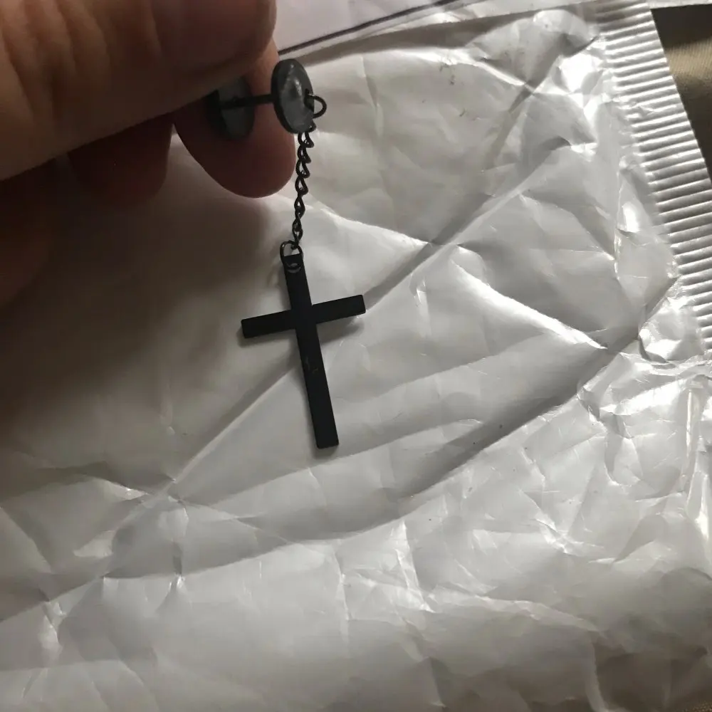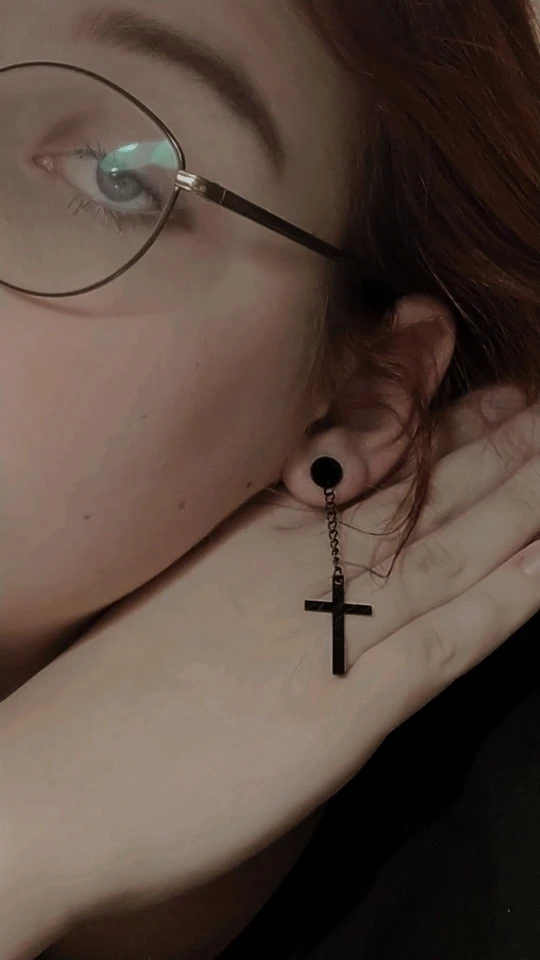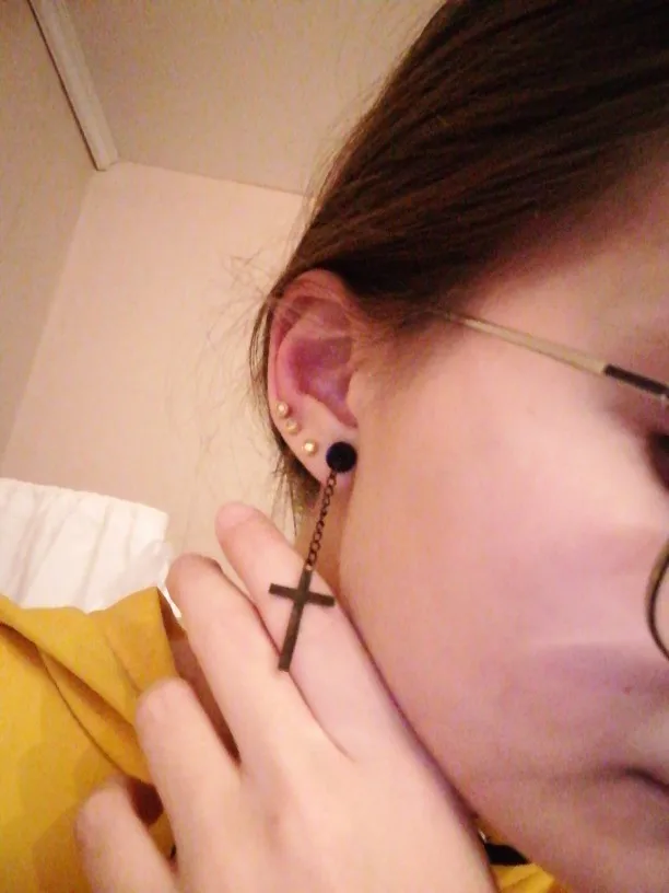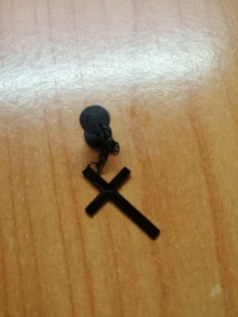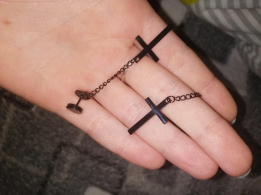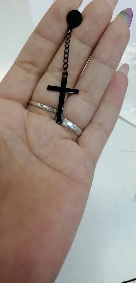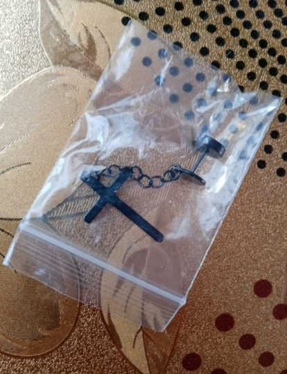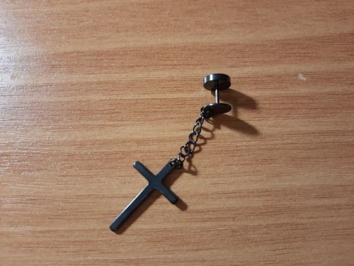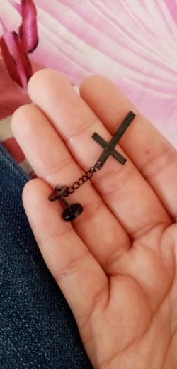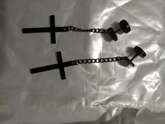 Здарова, сатанюги. Я теперь в ваших рядах. Крестик как крестик, свои денюжки отрабатывает. Застежка плотная, завинчивается как на пирсе. Краска пока не слазит, легкий, на ухе не ощущается