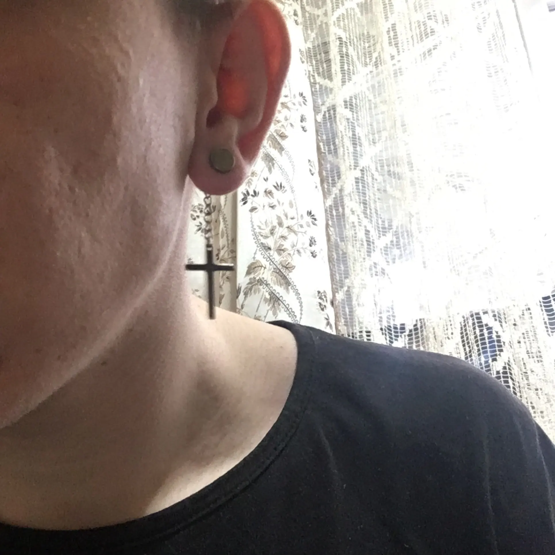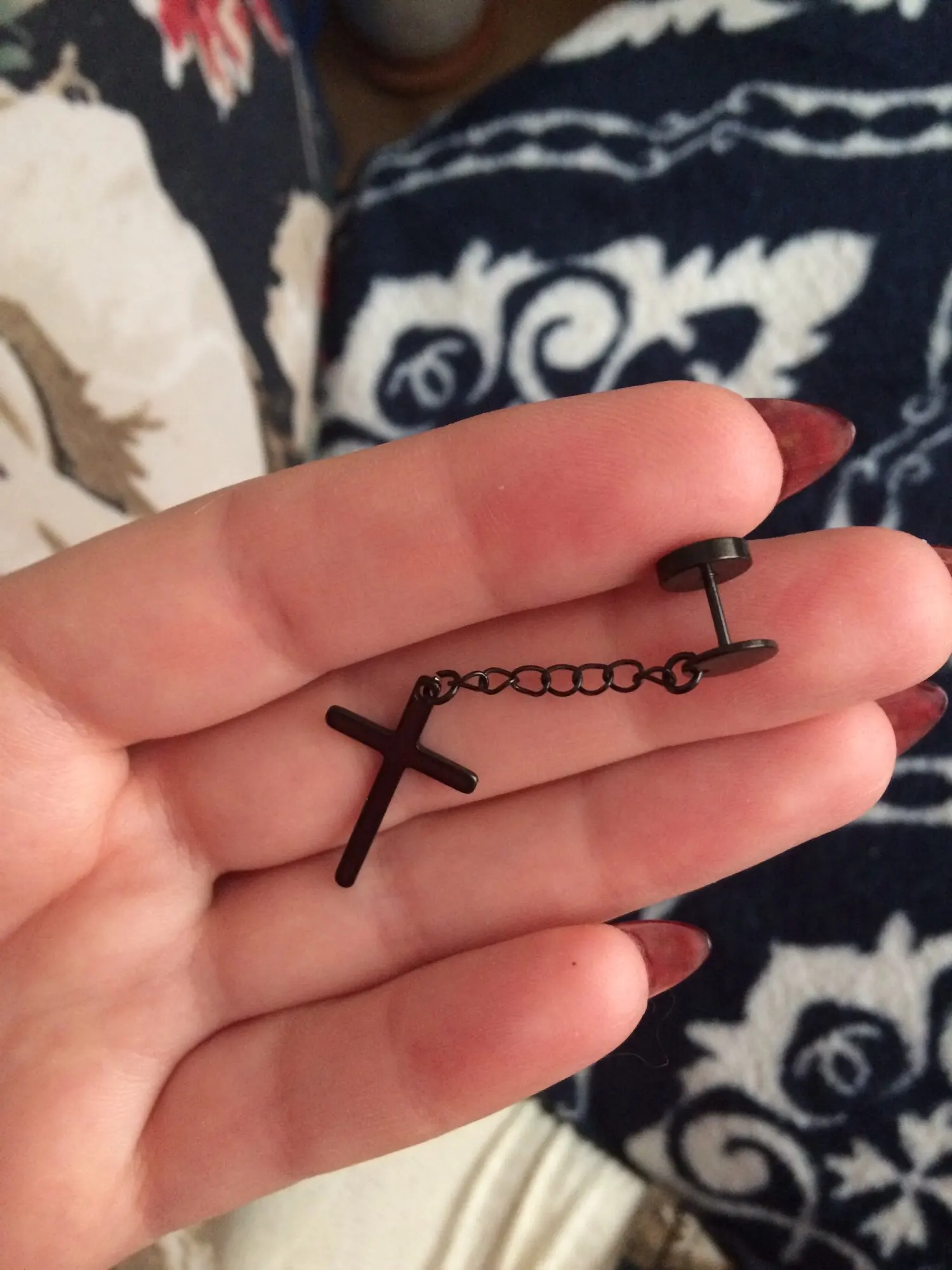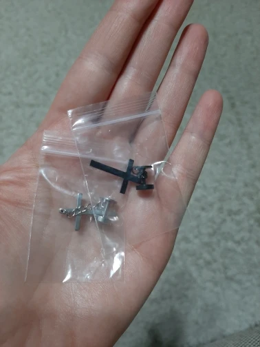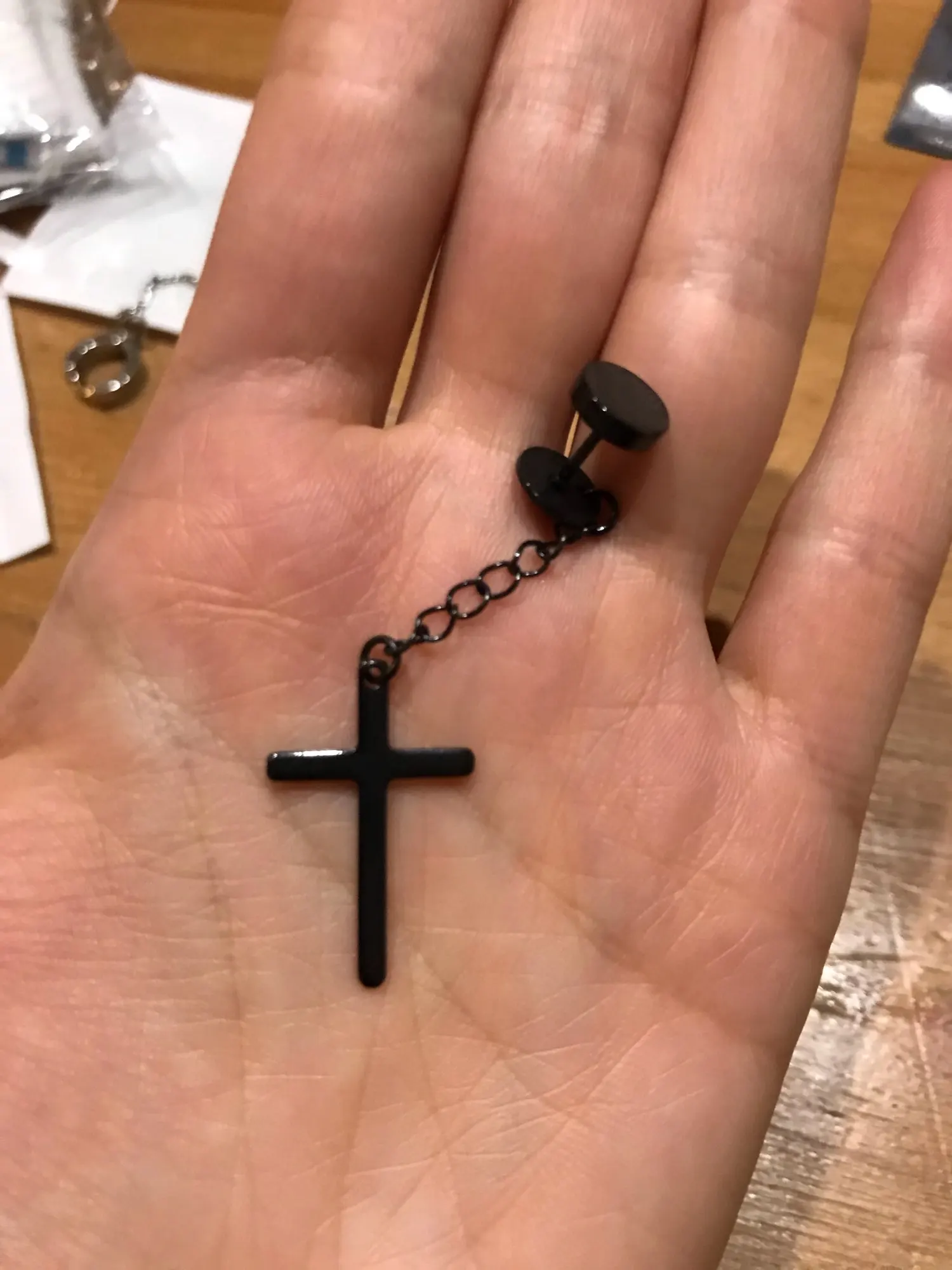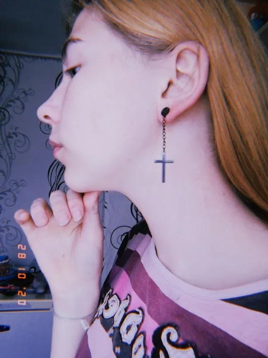 Здарова, сатанюги. Я теперь в ваших рядах. Крестик как крестик, свои денюжки отрабатывает. Застежка плотная, завинчивается как на пирсе. Краска пока не слазит, легкий, на ухе не ощущается